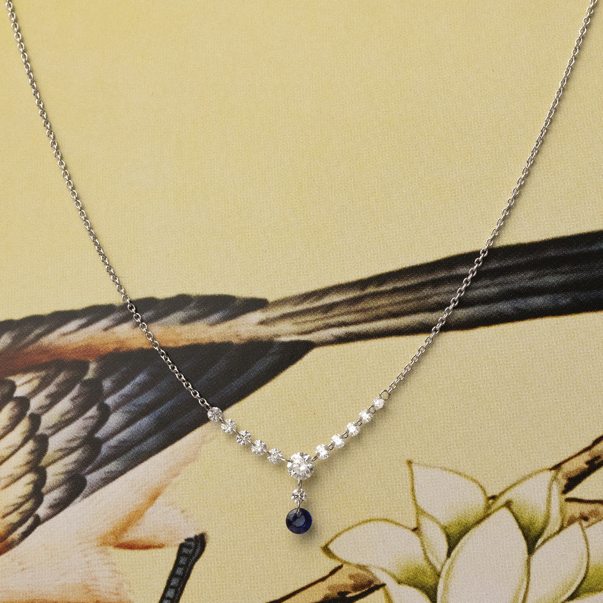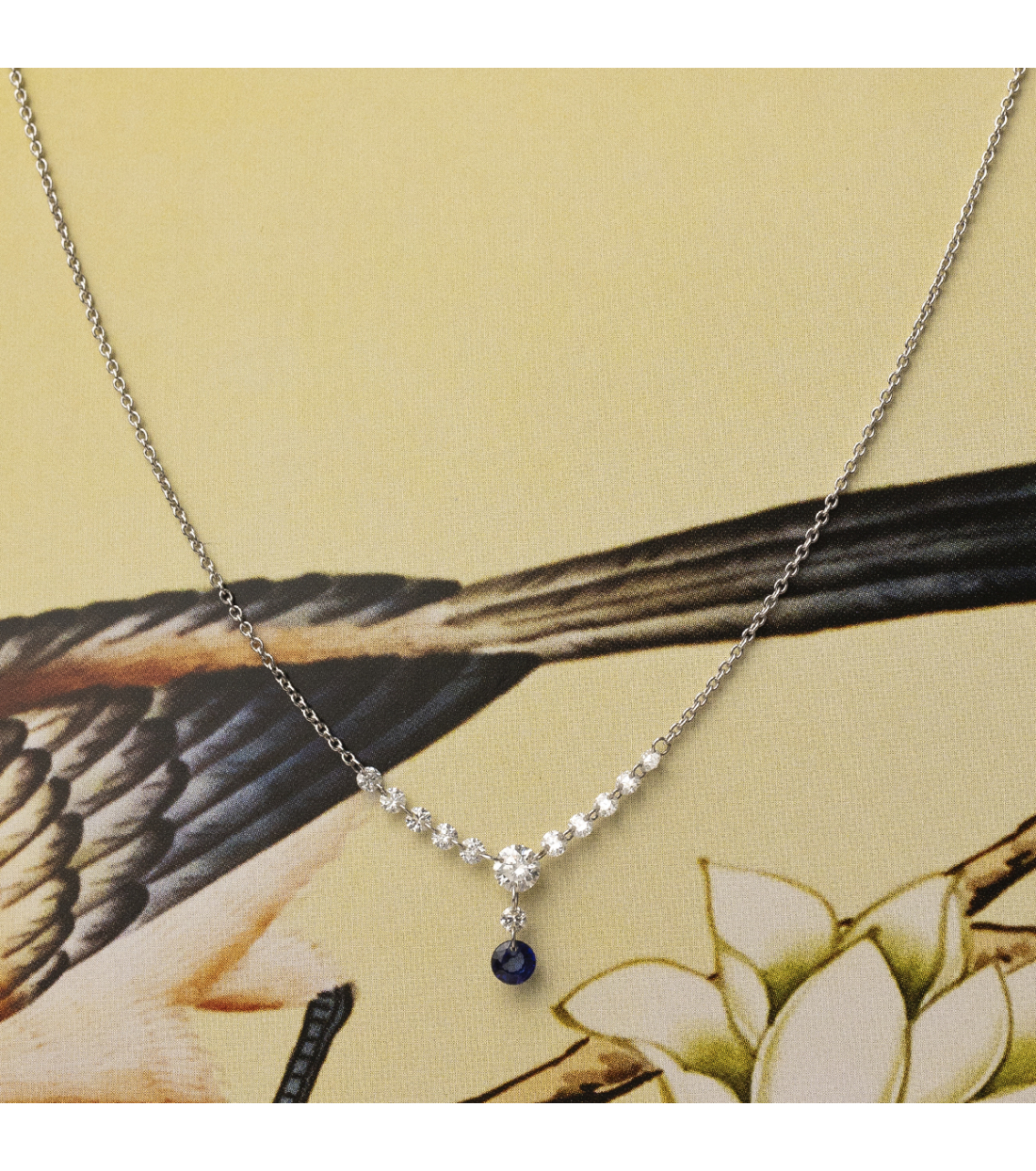 "Almudena" necklace in white gold with diamond-studded sapphire pendant. Avant-garde design and flattering contour.