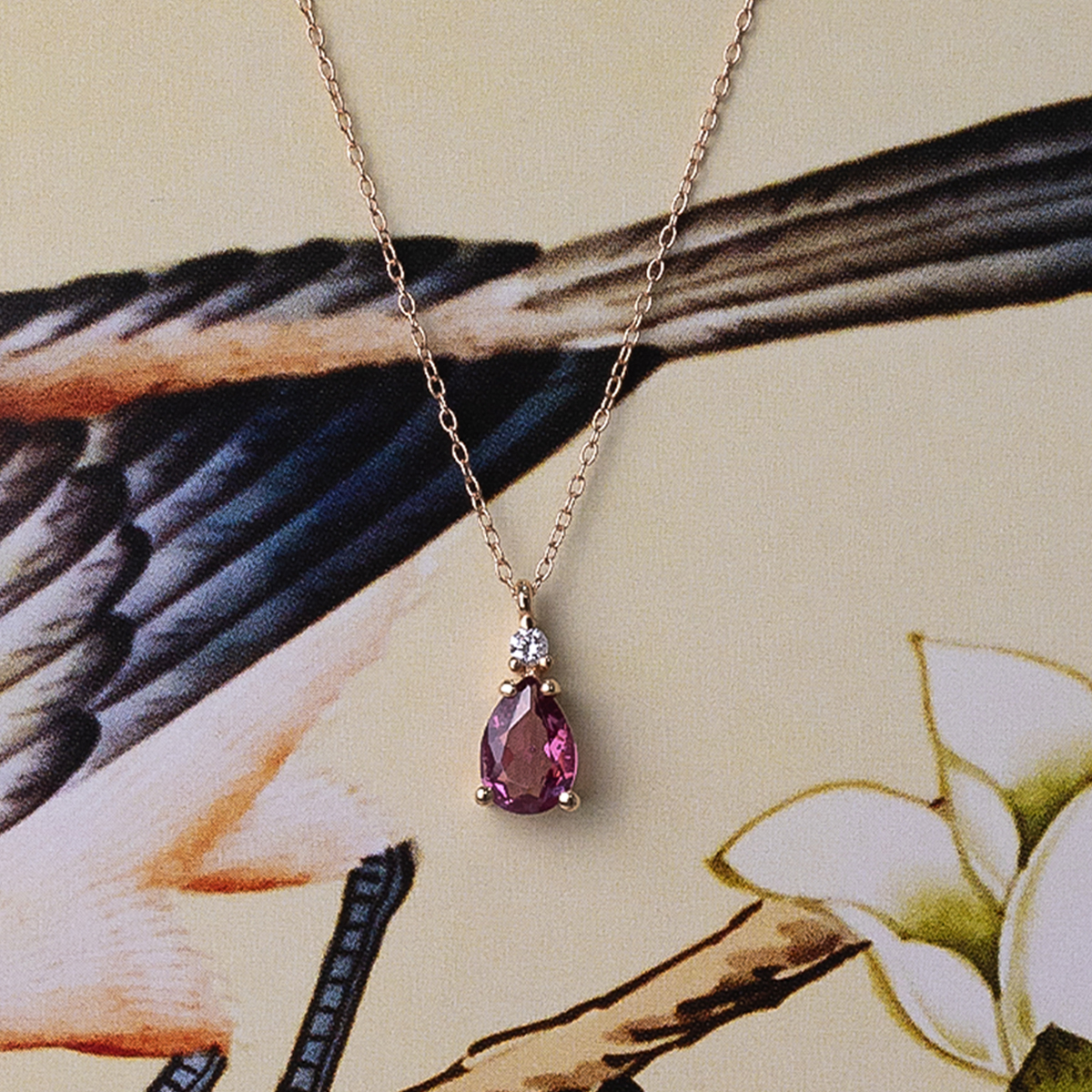 "Aurora" necklace in 18kt yellow gold with round-cut diamond (0.03 ct.) and drop-cut rhodolite. Its classic and versatile design is perfect for adding a touch of sophistication to any look.