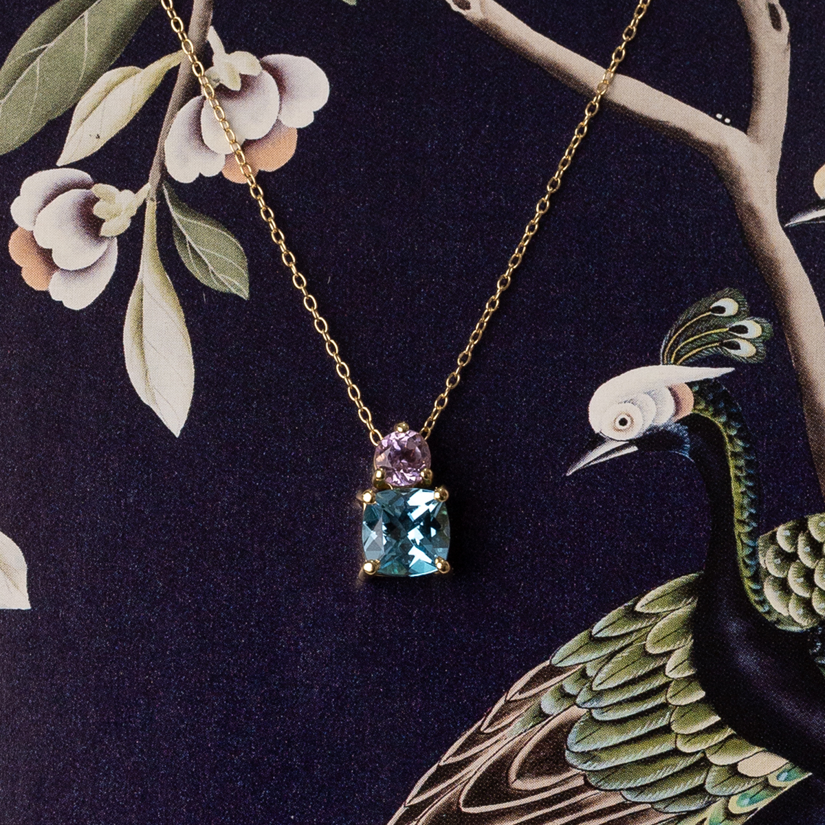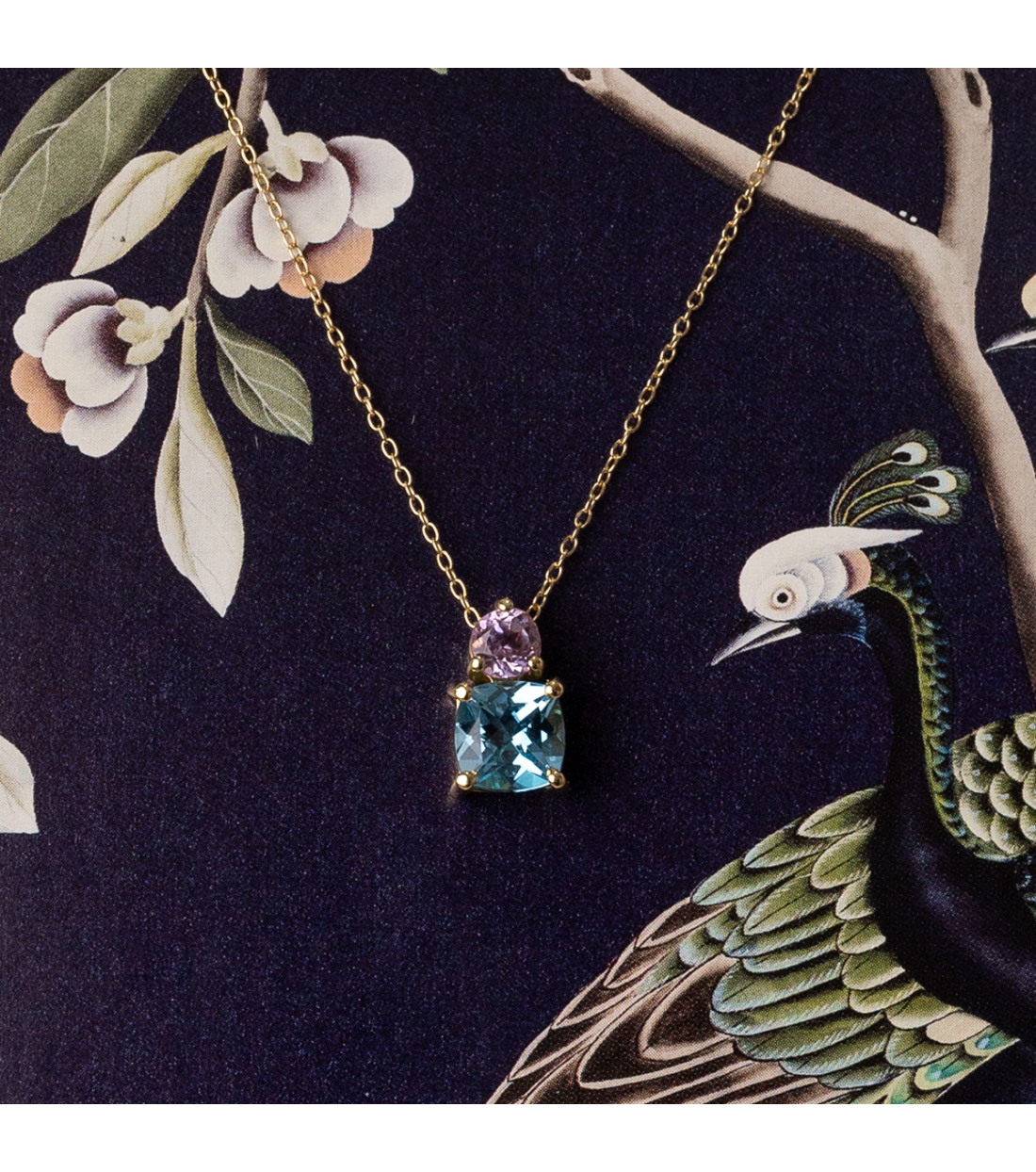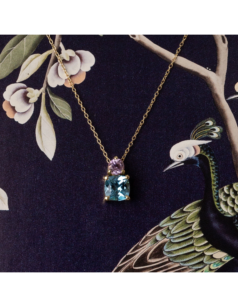 Necklace "Celia" in 18kt. yellow gold with round-cut amethyst and cushion-cut blue topaz. A unique and sophisticated piece, perfect for any occasion.