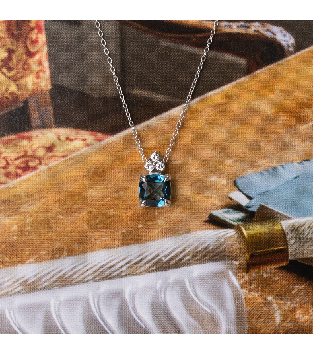 Necklace “Lorella”, 18kt white gold chain and pendant with London Blue topaz and round-cut diamonds (0.06 cts). The perfect accessory for an elegant woman!