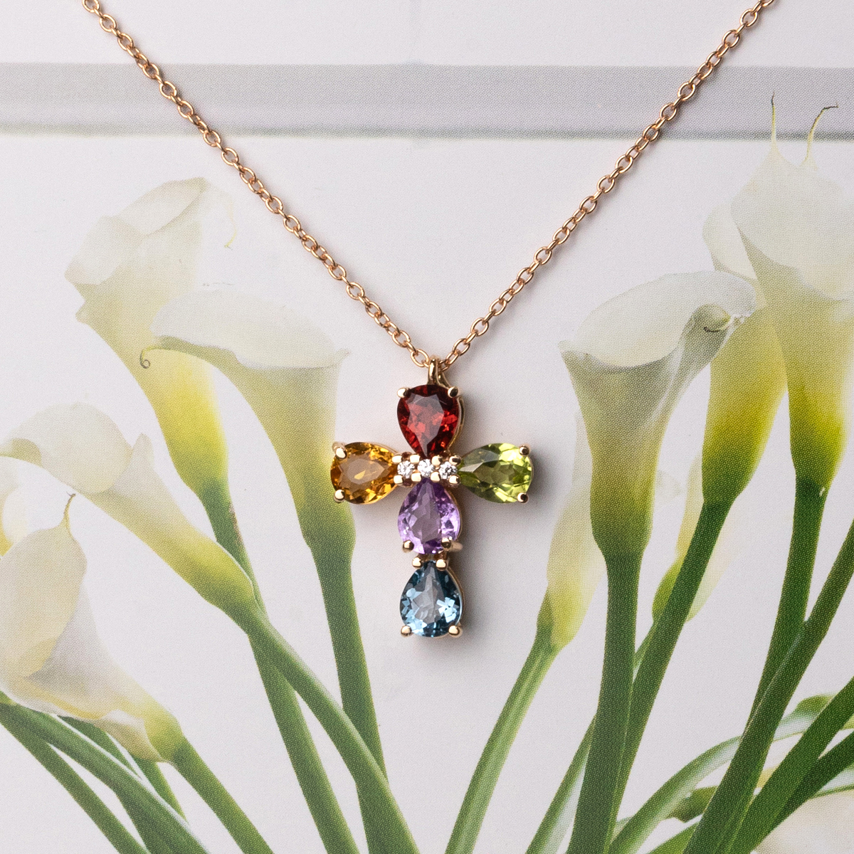 Necklace “Georgette” composed of 18kt rose gold chain and cross with diamonds and semiprecious stones such as topaz London blue, peridot and amethyst. A special jewel charged with positive energy.