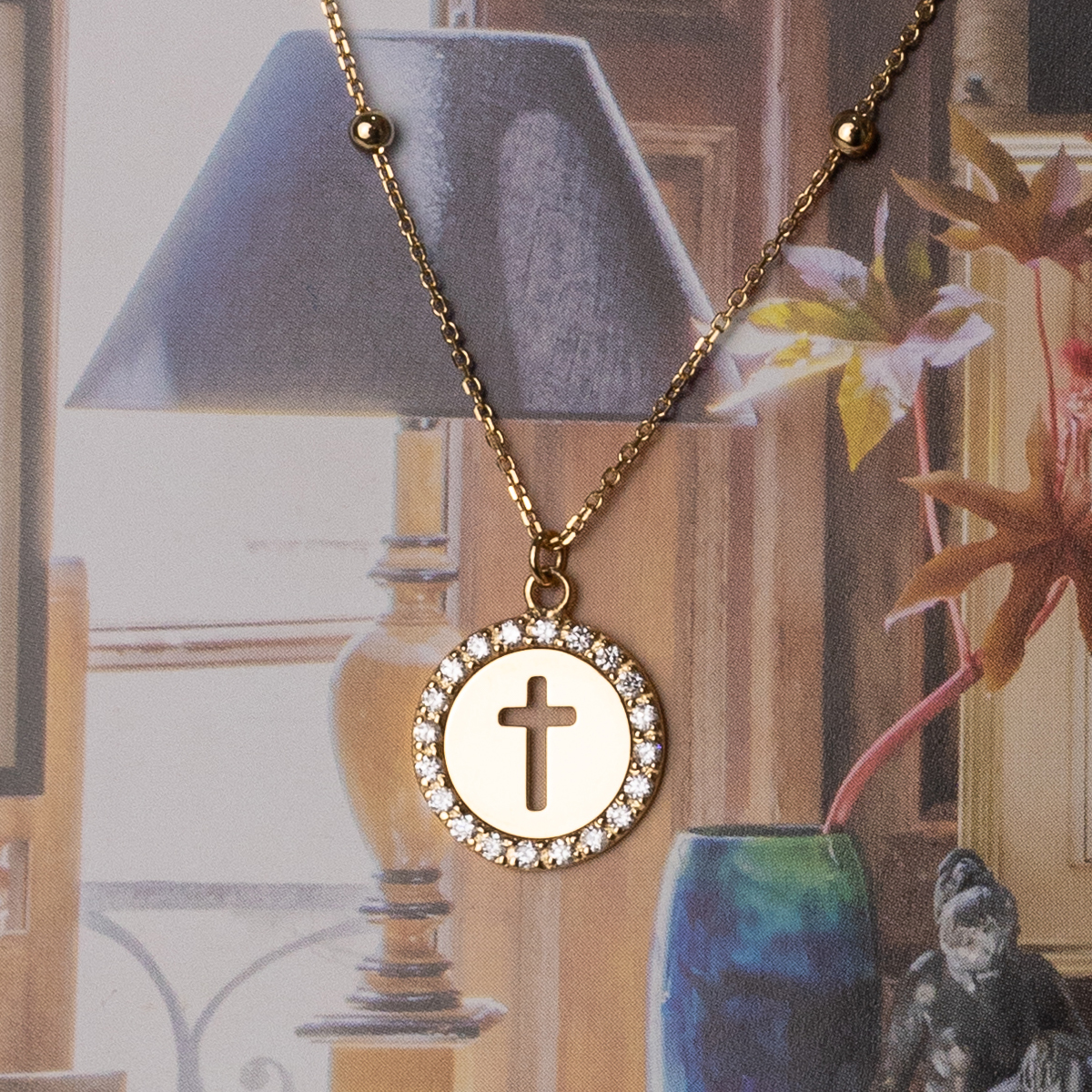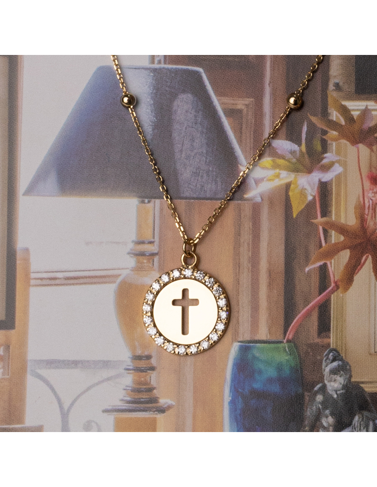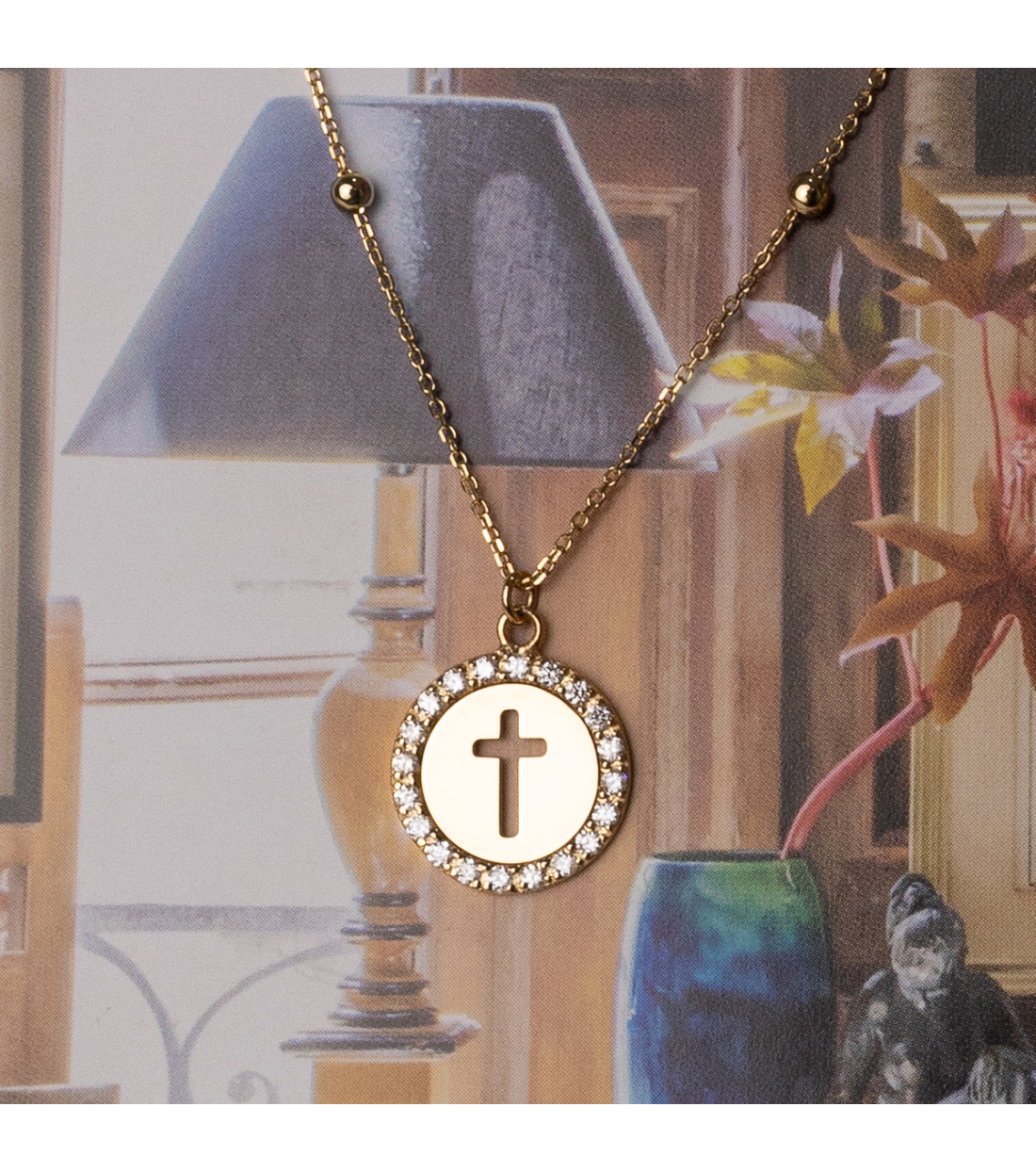 Necklace “Cecilia” in 18kt. yellow gold with ball chain and round pendant with cross die, beveled with round-cut diamonds (0.15 Cts.). Perfect for any occasion.