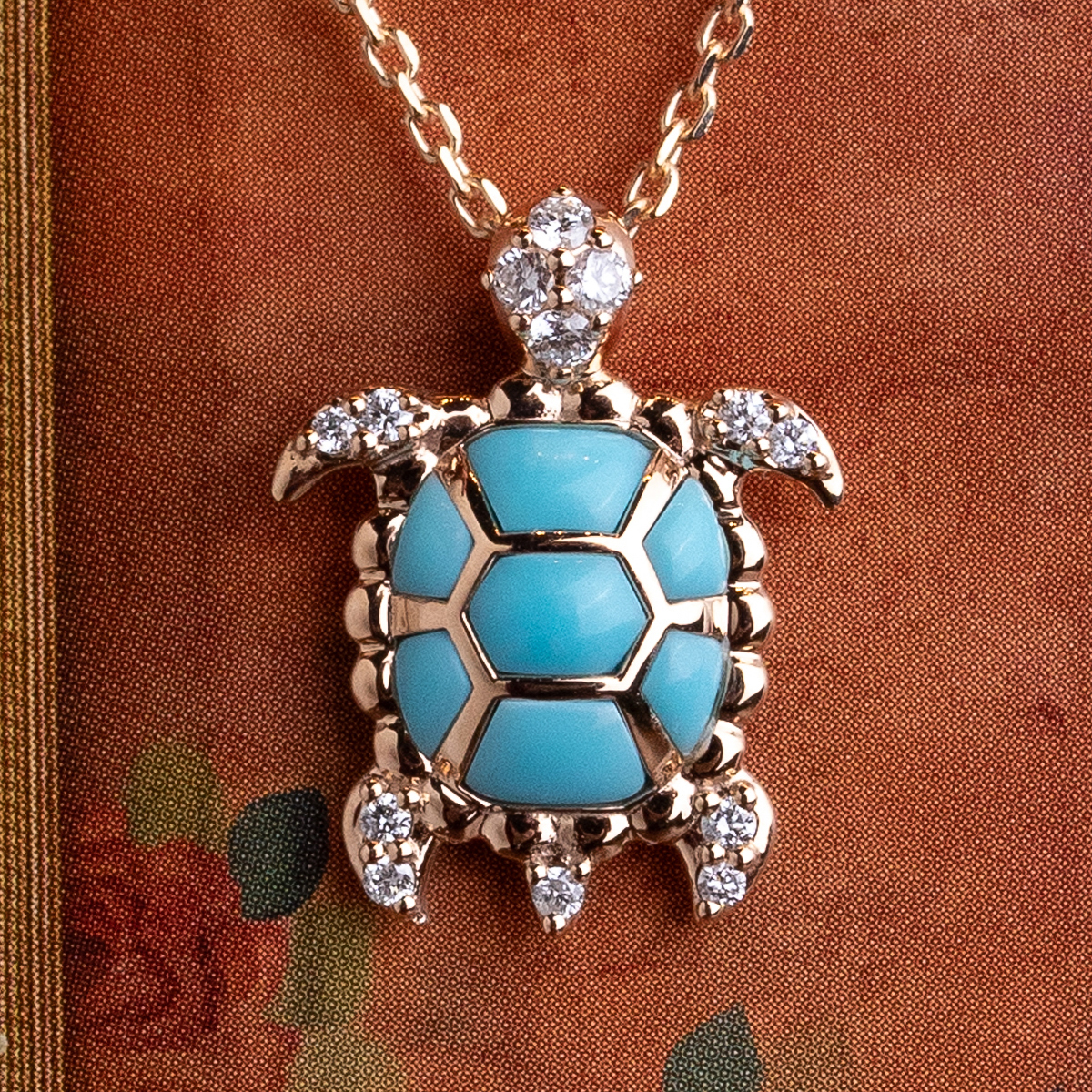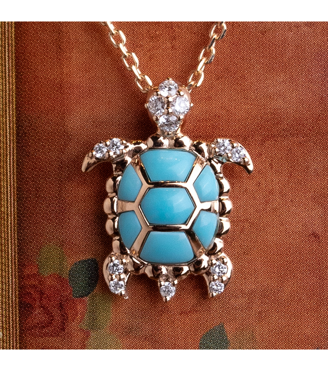 Necklace “Dafne” composed of 18kt rose gold chain and pendant plus turtle element with round-cut diamonds 0.12Cts. and turquoise 0.46Cts. An exquisite jewel that fuses luxury and symbolism in a unique piece.