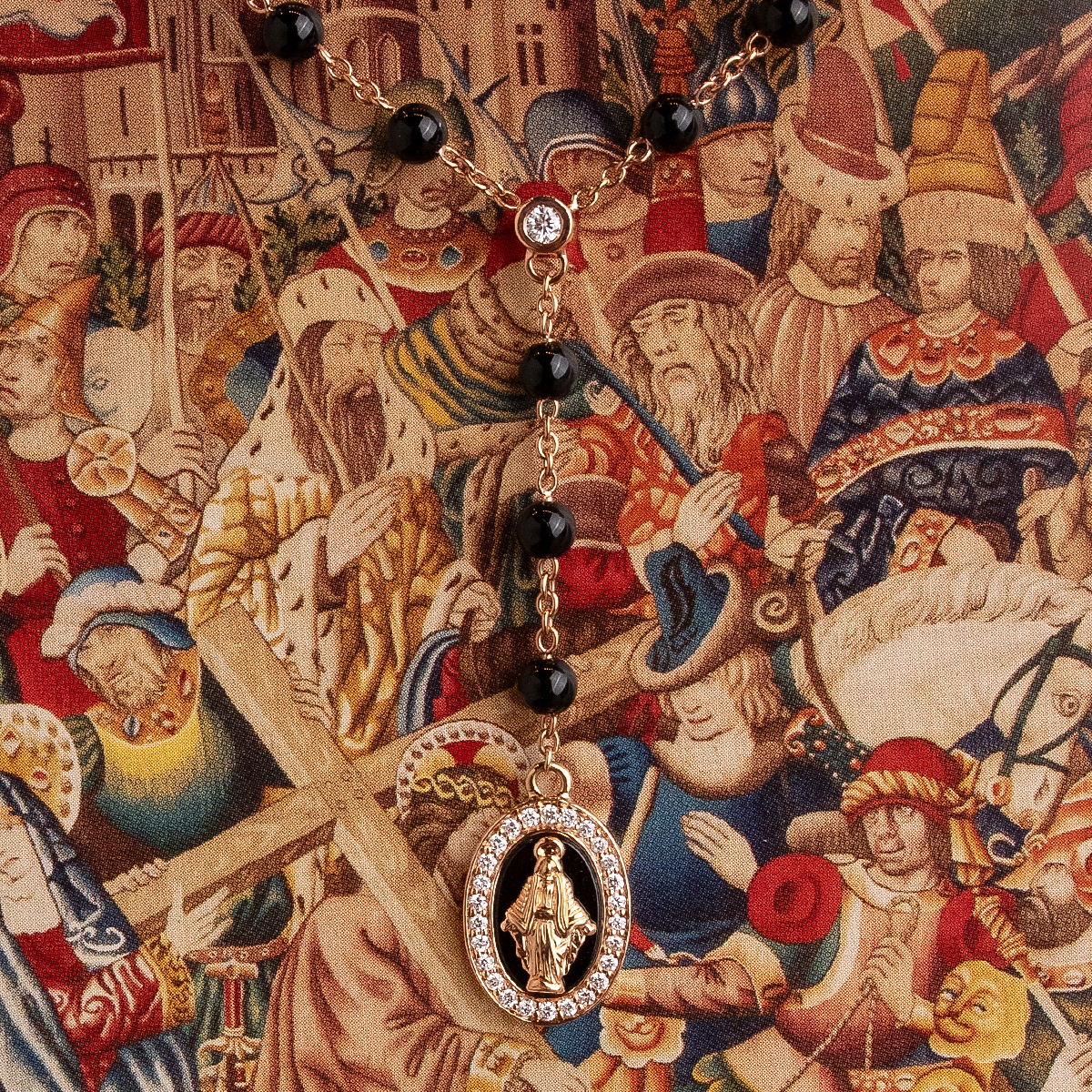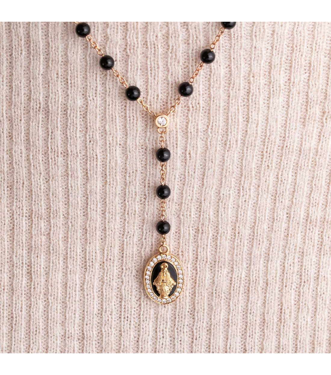 Necklace “Adaya” in 18kt rose gold with onyx beads 6.32 Cts. and La Milagrosa medal with brilliant cut diamond bezel 0.15 Cts. An elegant and spiritual design for any occasion.