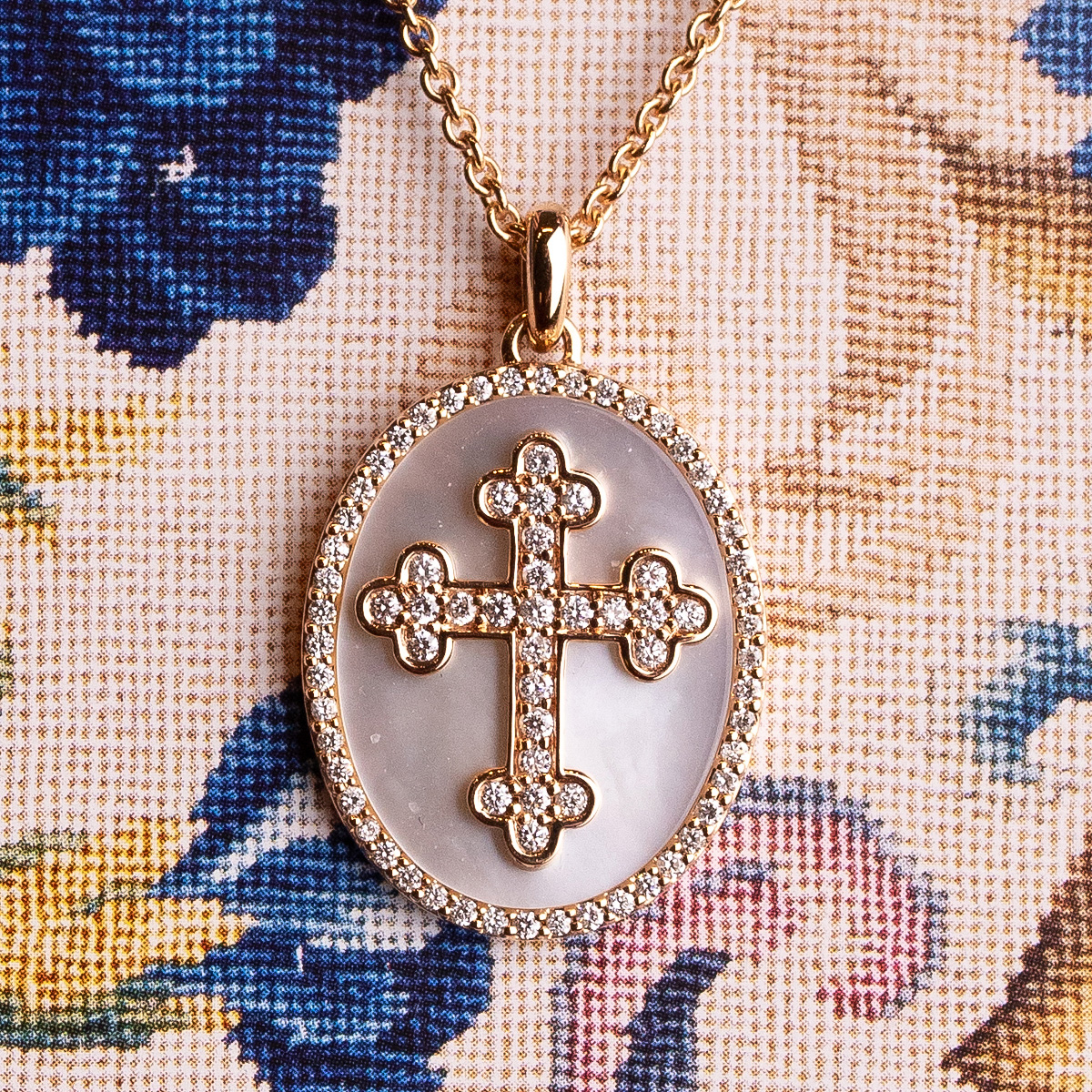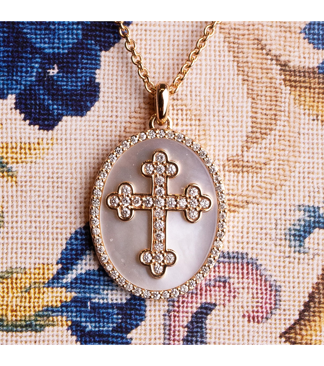 Necklace “Blair” in 18kt rose gold with cross medal and bezel set round-cut diamonds 0.28Cts. and mother of pearl background. An elegant and spiritual design for any occasion.