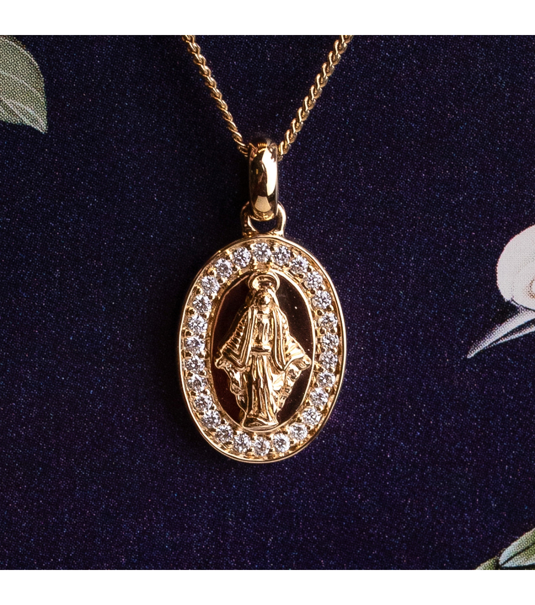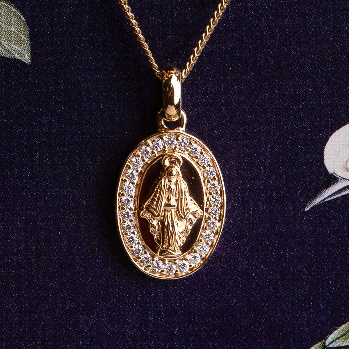 Necklace “Arlet” made of 18kt yellow gold composed of chain and medal of the Miraculous Virgin Mary with roud-cut diamonds bezel 0.11Cts. A symbol of faith and sophistication.