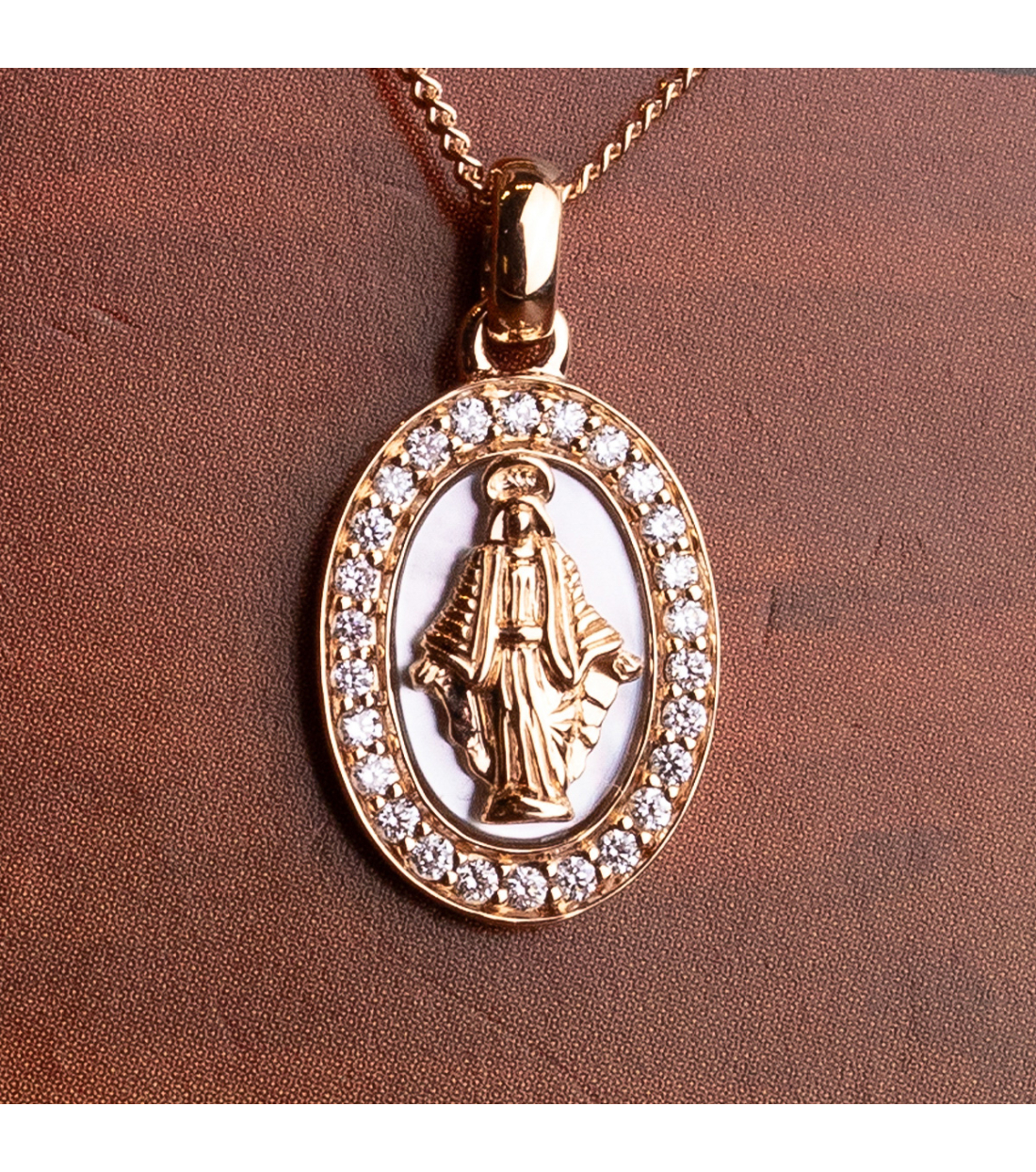 Necklace “Malak” in 18kt. rose gold composed of chain and medal of the Virgin of La Milagrosa with round-cut diamonds bezel 0.11Cts. and mother of pearl. Sophisticated and spiritual, ideal for all occasions.