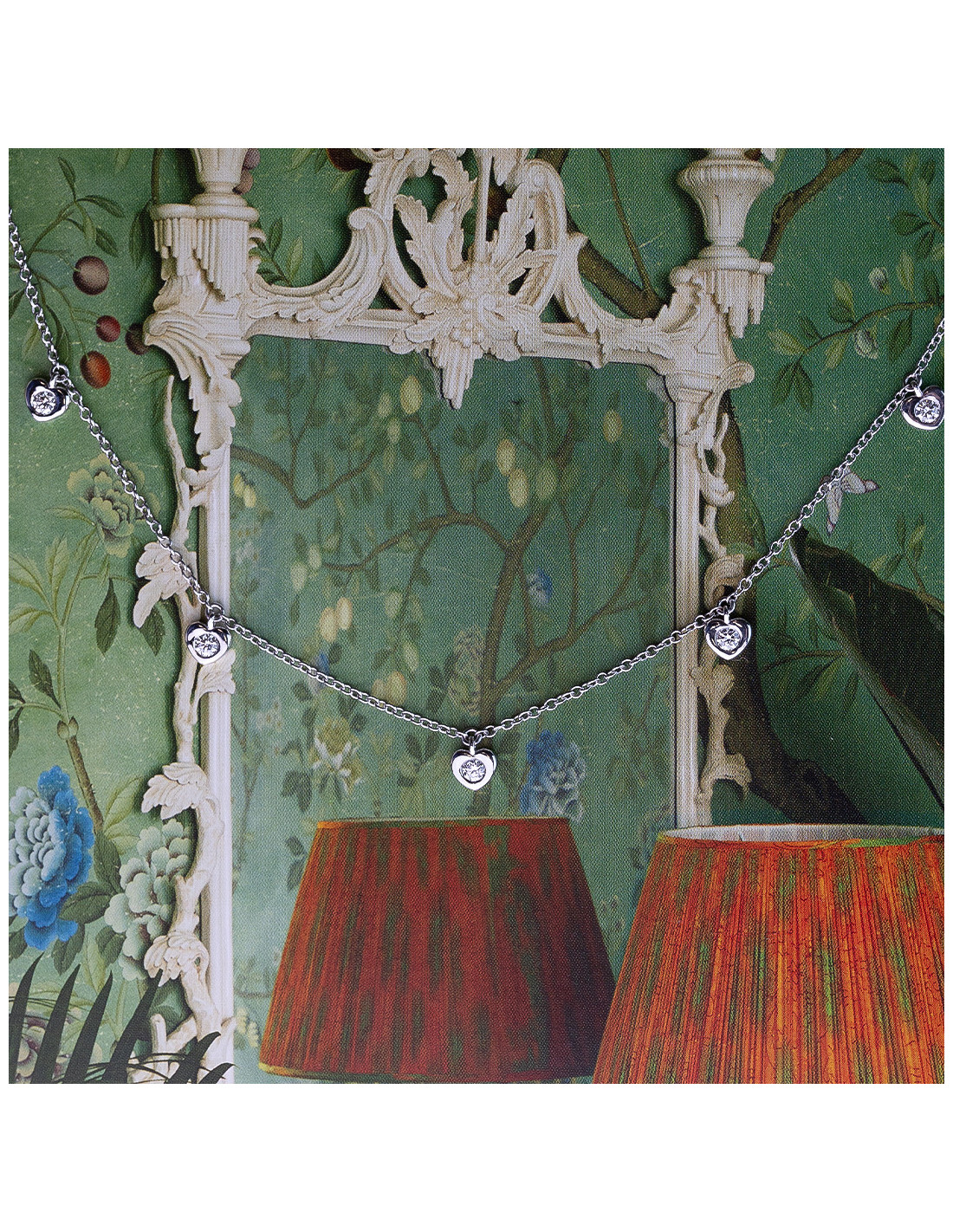 Love" necklace in 18kt white gold with diamond hearts. Romantic elegance in every heartbeat.