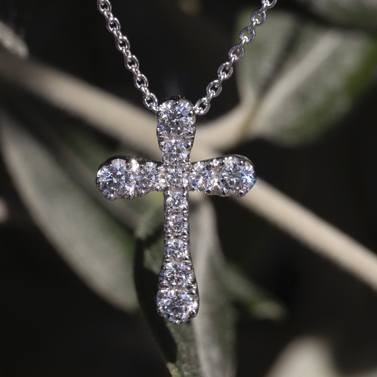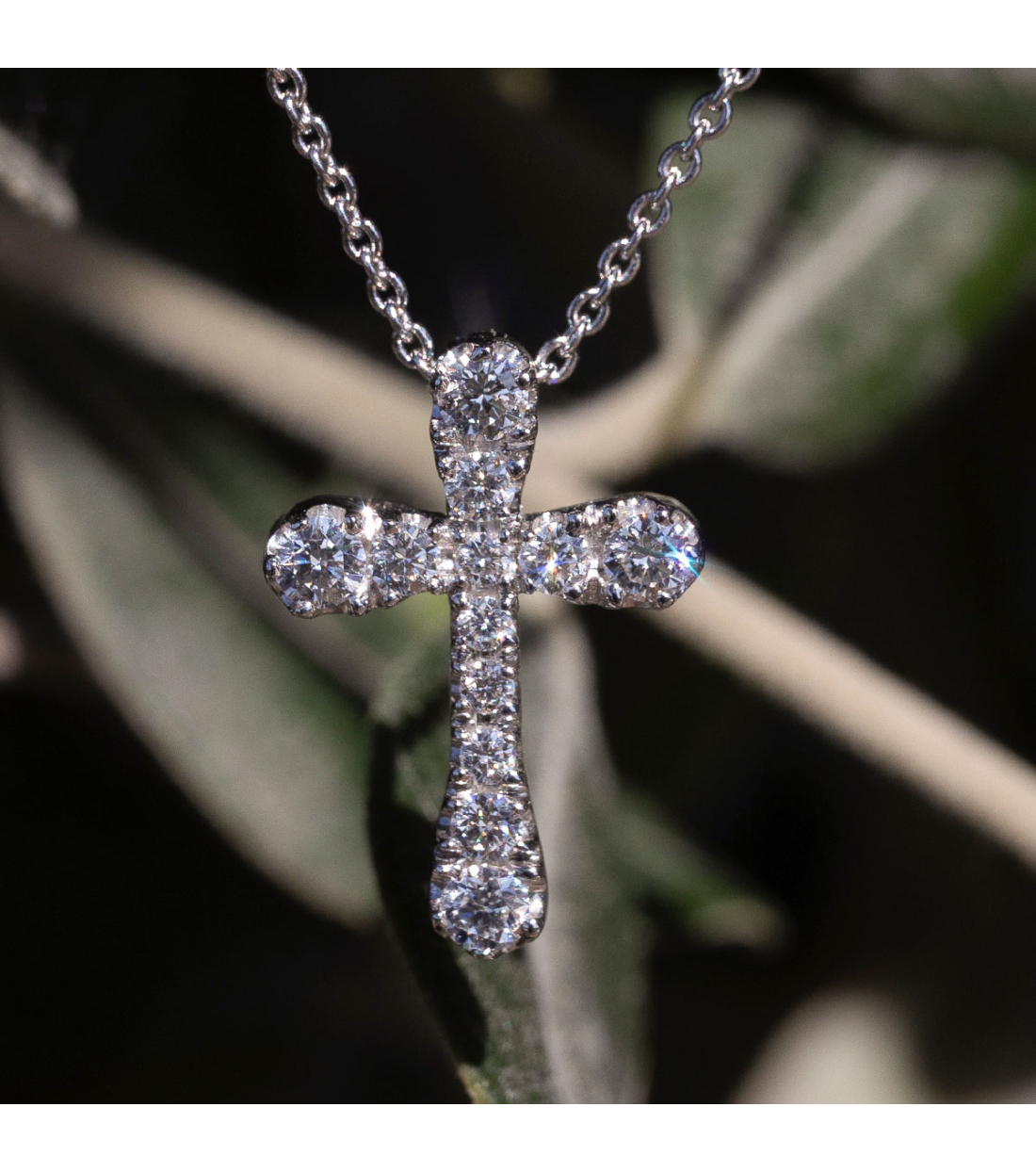 Necklace comprised of a chain and cross in white gold and diamonds. A symbol of faith and elegance.