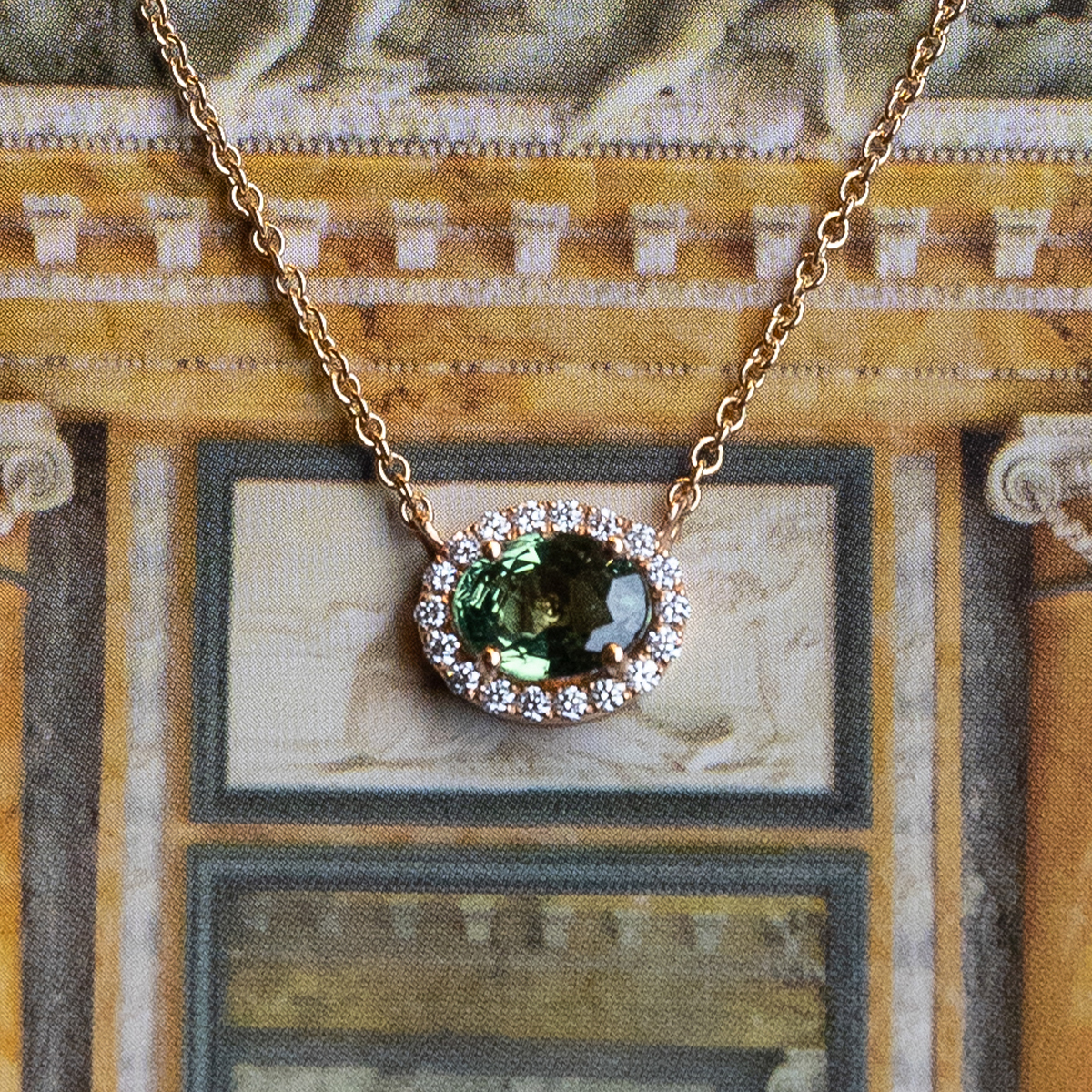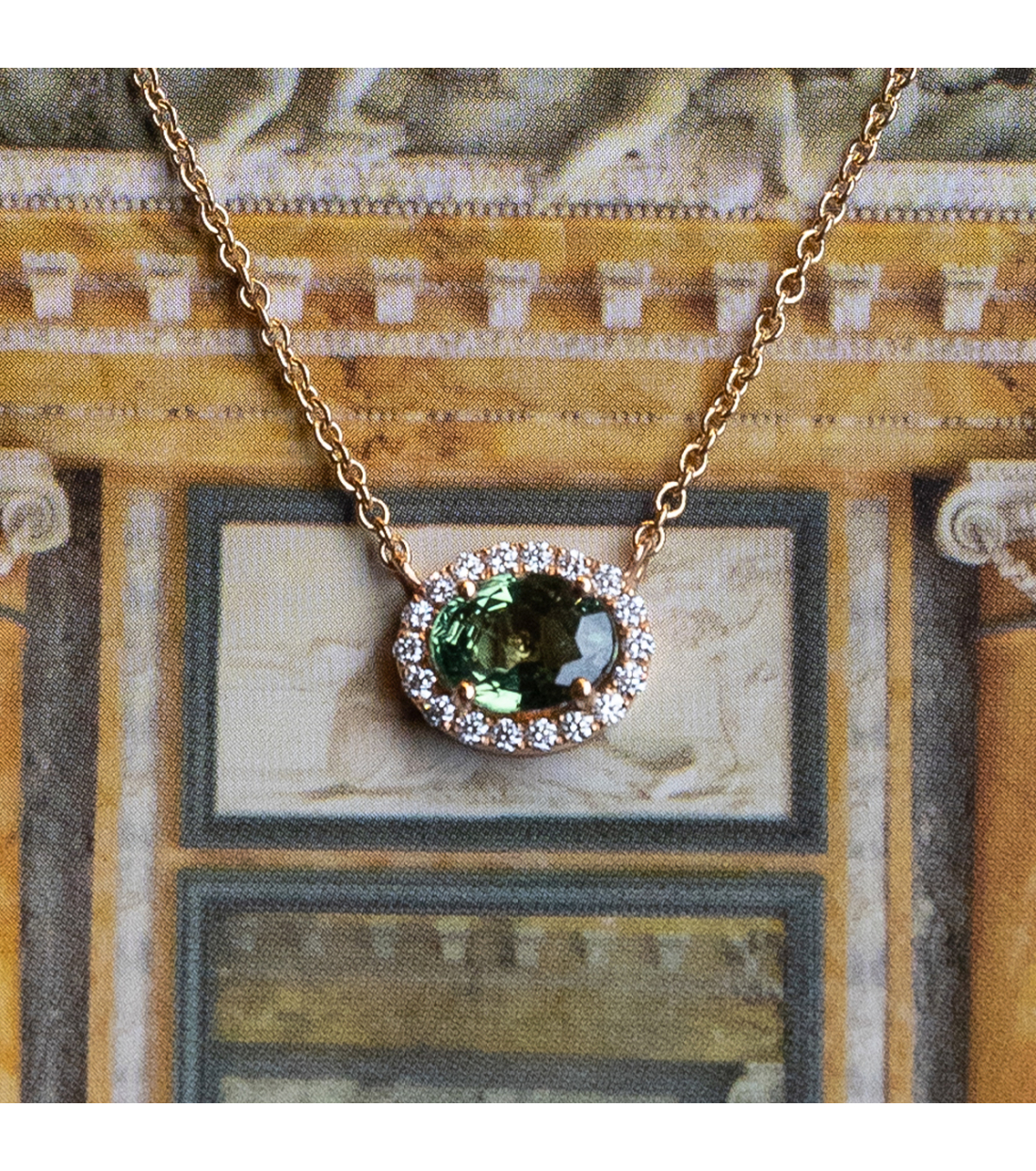 Elsa” necklace in 18kt. rose gold with oval cut green sapphire with round-cut diamonds bezel set. A sophisticated and timeless design that will enhance any look.