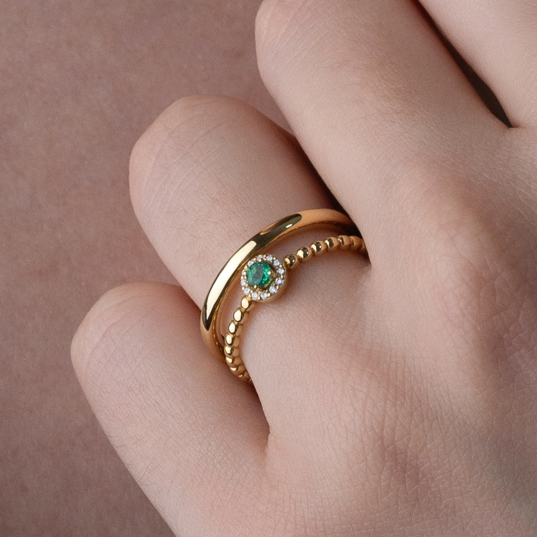 Hope" double ring in 18kt yellow gold with emerald and diamonds. A touch of elegance for your everyday.