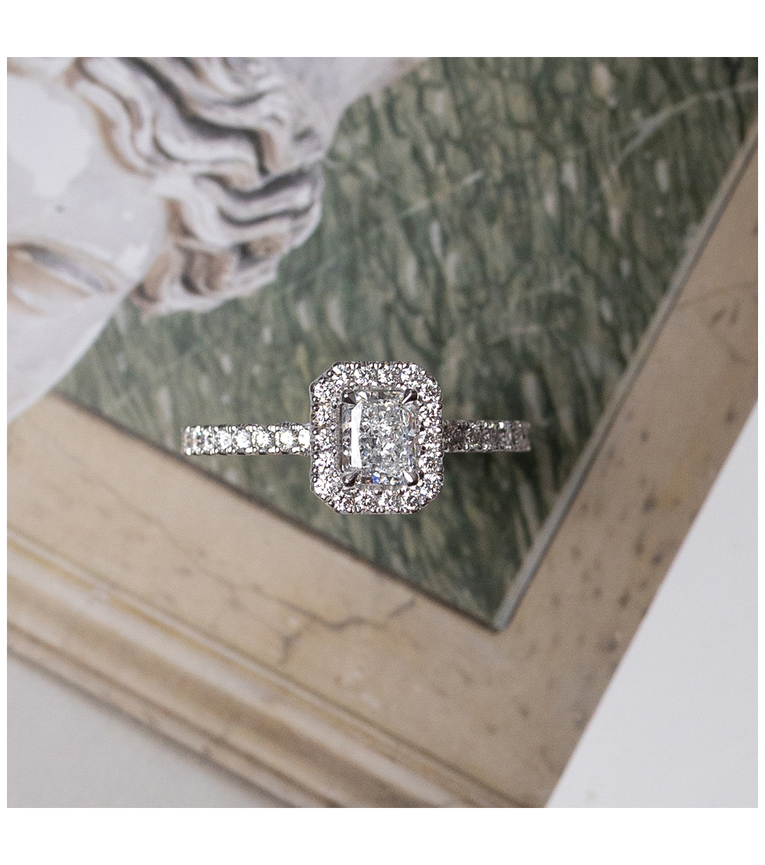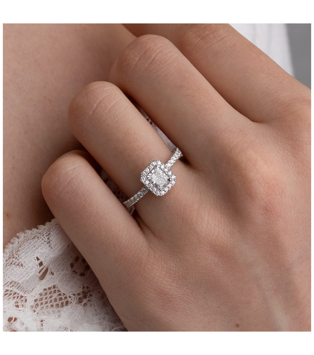 Alejandra’ engagement ring in white gold with princess-cut central diamond and round-cut diamond bezel set (0.92 ct.). A unique piece for an unforgettable moment.