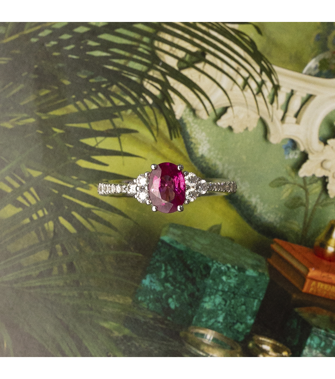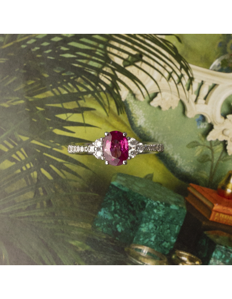 "Valentina" ring in white gold with diamonds and ruby. Timeless elegance for any occasion.