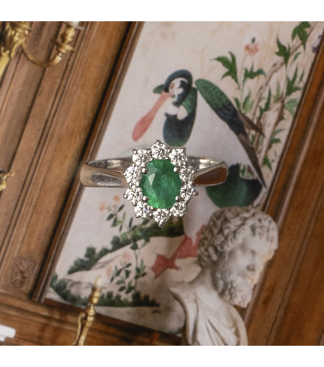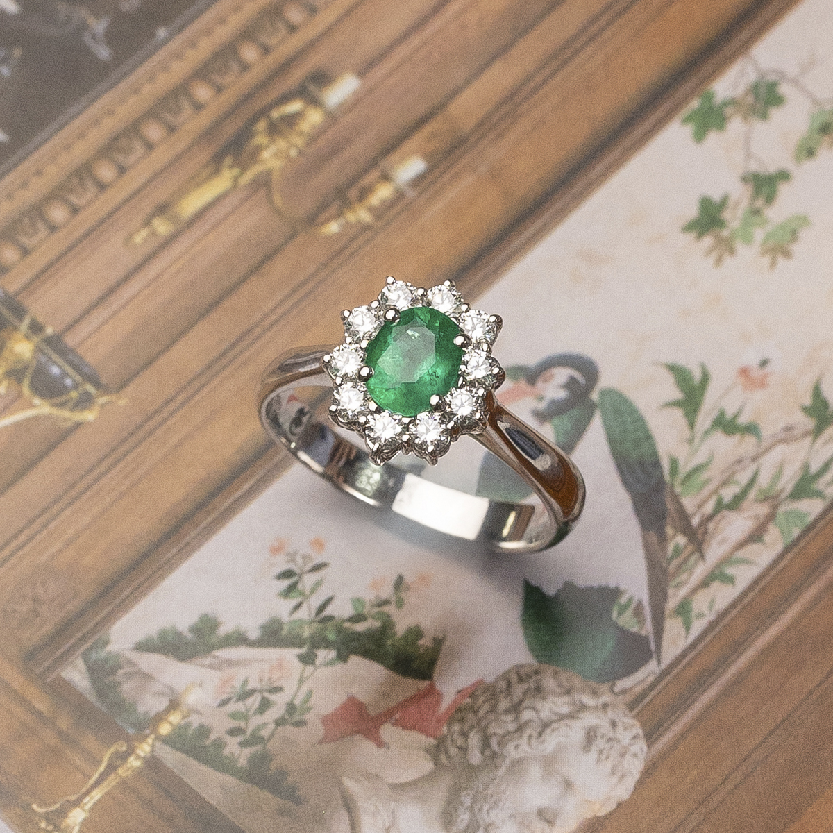 "Susana” ring in white gold with brilliant-cut diamonds (0.38 cts) and oval-cut emerald (0.62 cts). A Secret Garden in your hand.