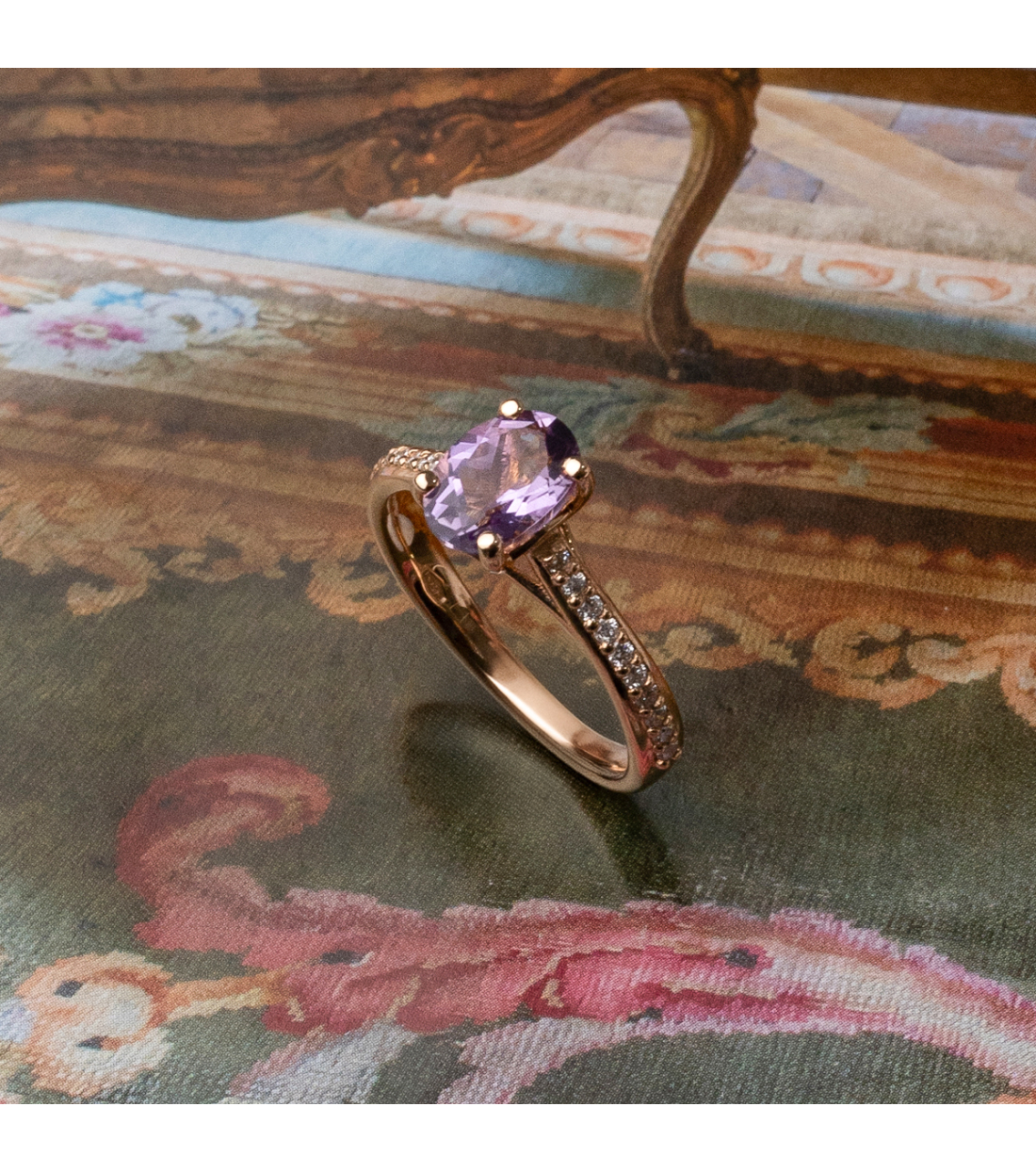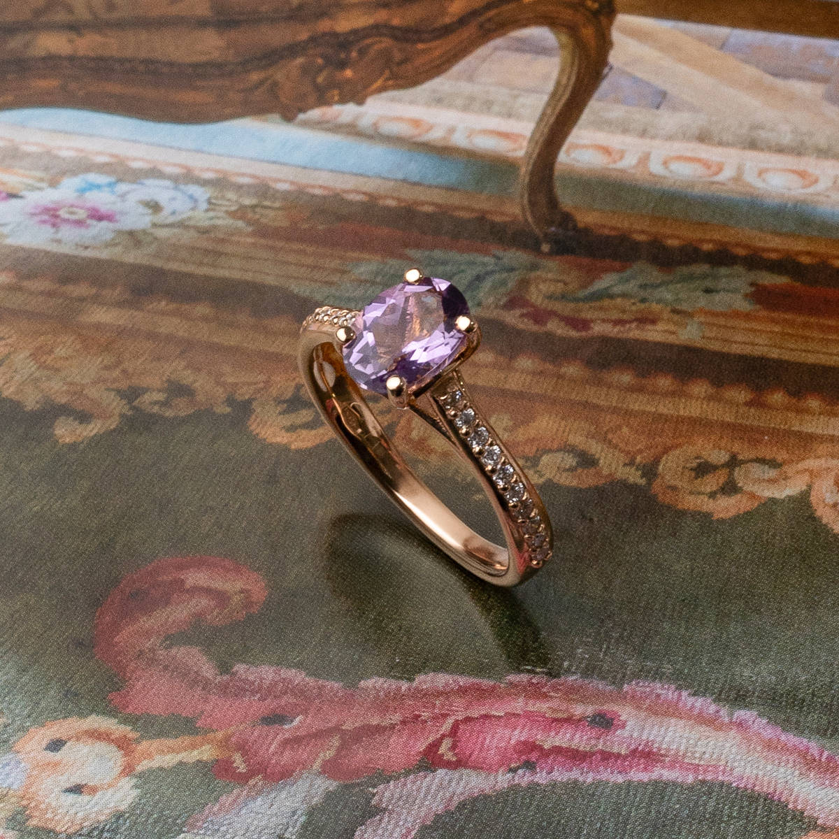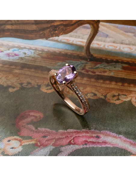 "Alix” ring in rose gold with round cut diamonds (0.17 cts) and central amethyst. A romantic and sophisticated design for any occasion.