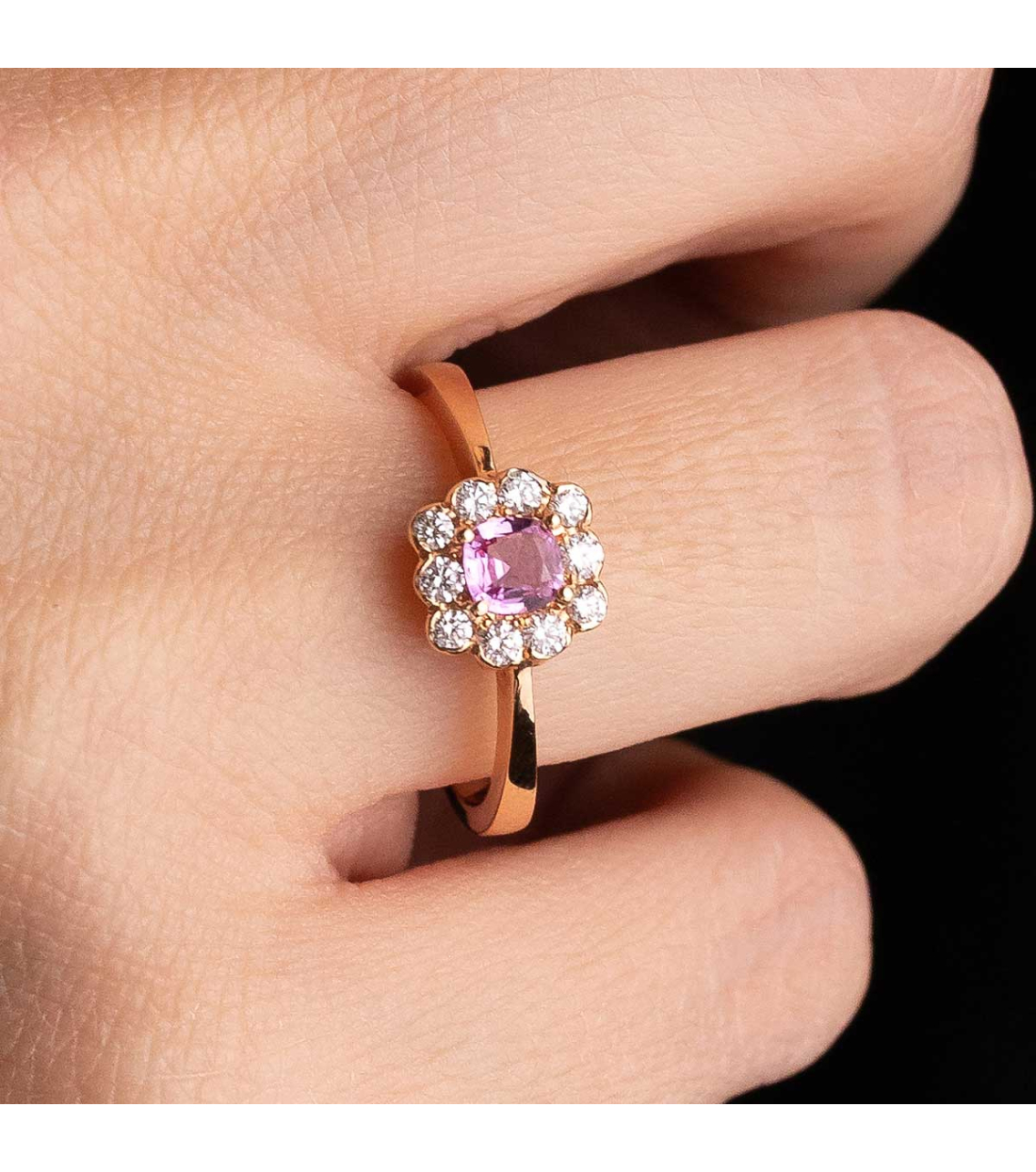 Dazzle with the timeless elegance of our ring. A cushion-cut pink sapphire of exquisite beauty is surrounded by a halo of sparkling diamonds, creating a flower in full bloom. The 18 karat rose gold brings warmth and sophistication to this piece of jewelry, making it the perfect accessory for any occasion. Its classic and timeless design will allow you to wear it every day with any style.