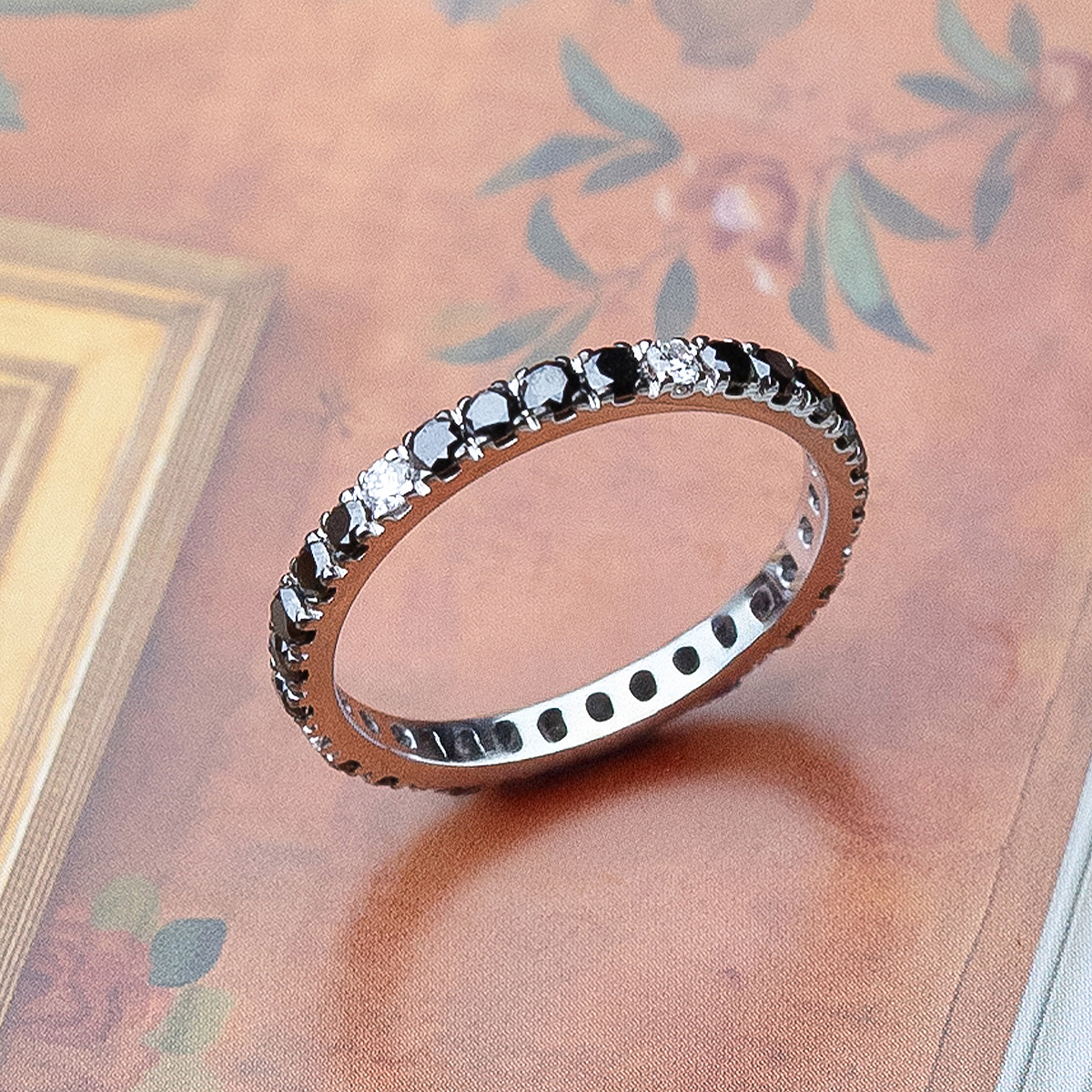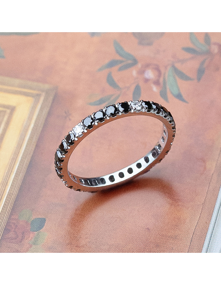 Lurdes” full wedding ring in white gold with brilliant-cut diamonds (0.13 Cts.) and brilliant-cut black diamonds (0.80 Cts.). Eternal and sophisticated elegance.