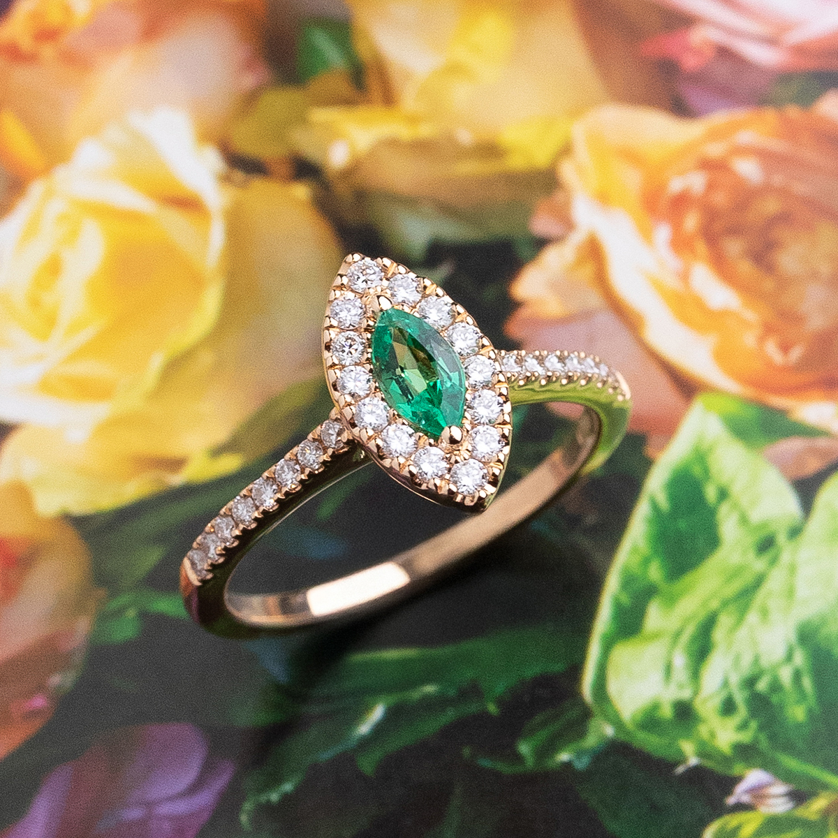 Sofia’ ring in 18kt rose gold with a marquise-cut emerald 0.25ct. and round-cut diamonds 0.31ct. Perfect for adding a touch of sophistication to your everyday style.
