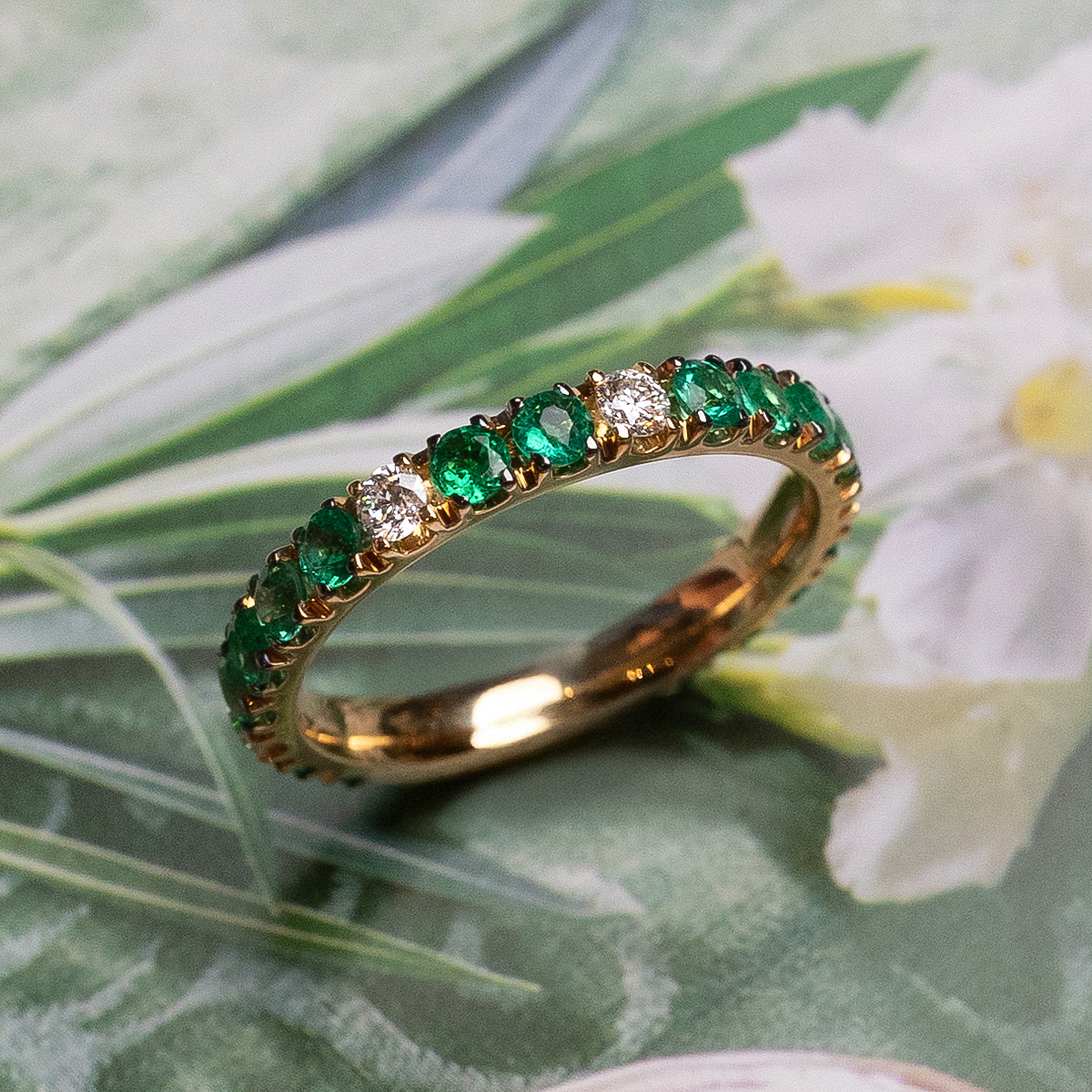 Ava” full wedding ring in yellow gold with brilliant-cut emeralds (1.04 Cts.) and brilliant-cut diamonds (0.25 Cts.). A sophisticated and versatile design, ideal for any occasion.