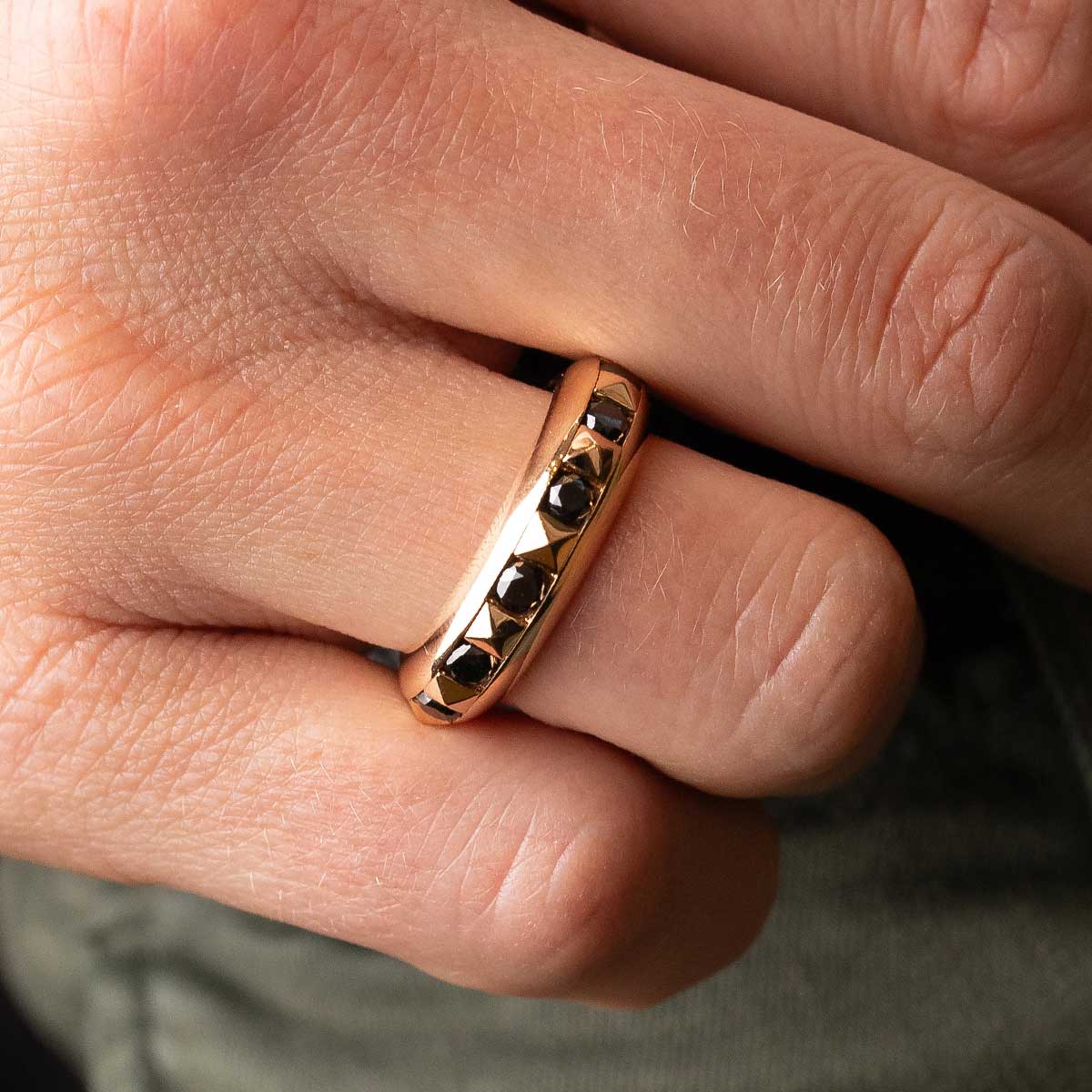 ‘Masato’ full wedding ring in 18k rose gold, set with exquisite 1.80ct round-cut black diamonds. A piece with personality, strength and style.