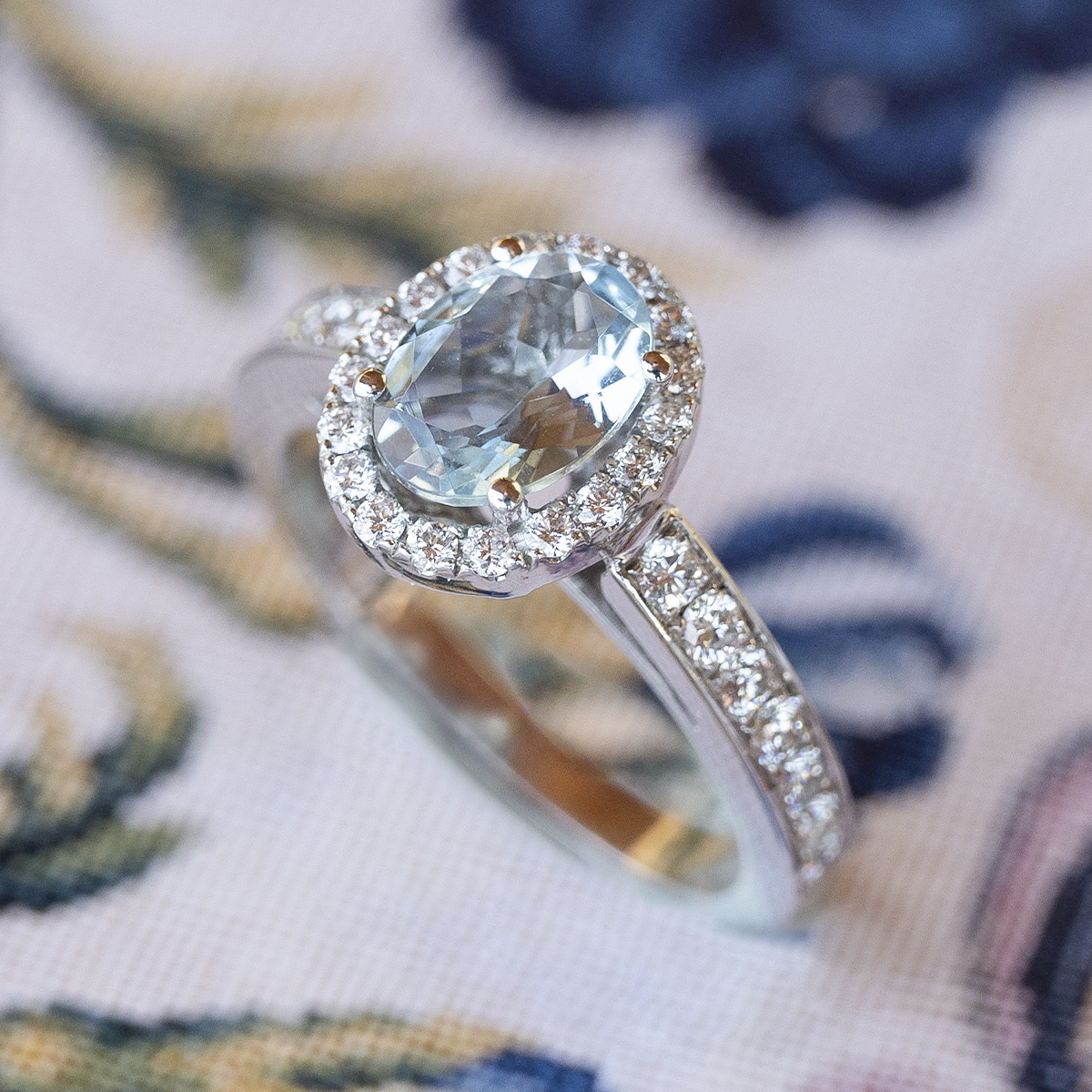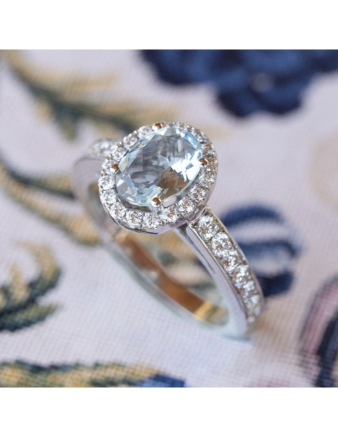 White gold “Sea” ring with oval cut aquamarine (0.91 cts) beveled with brilliant cut diamonds (0.50 cts). A timeless design that captures the essence of eternal love.
