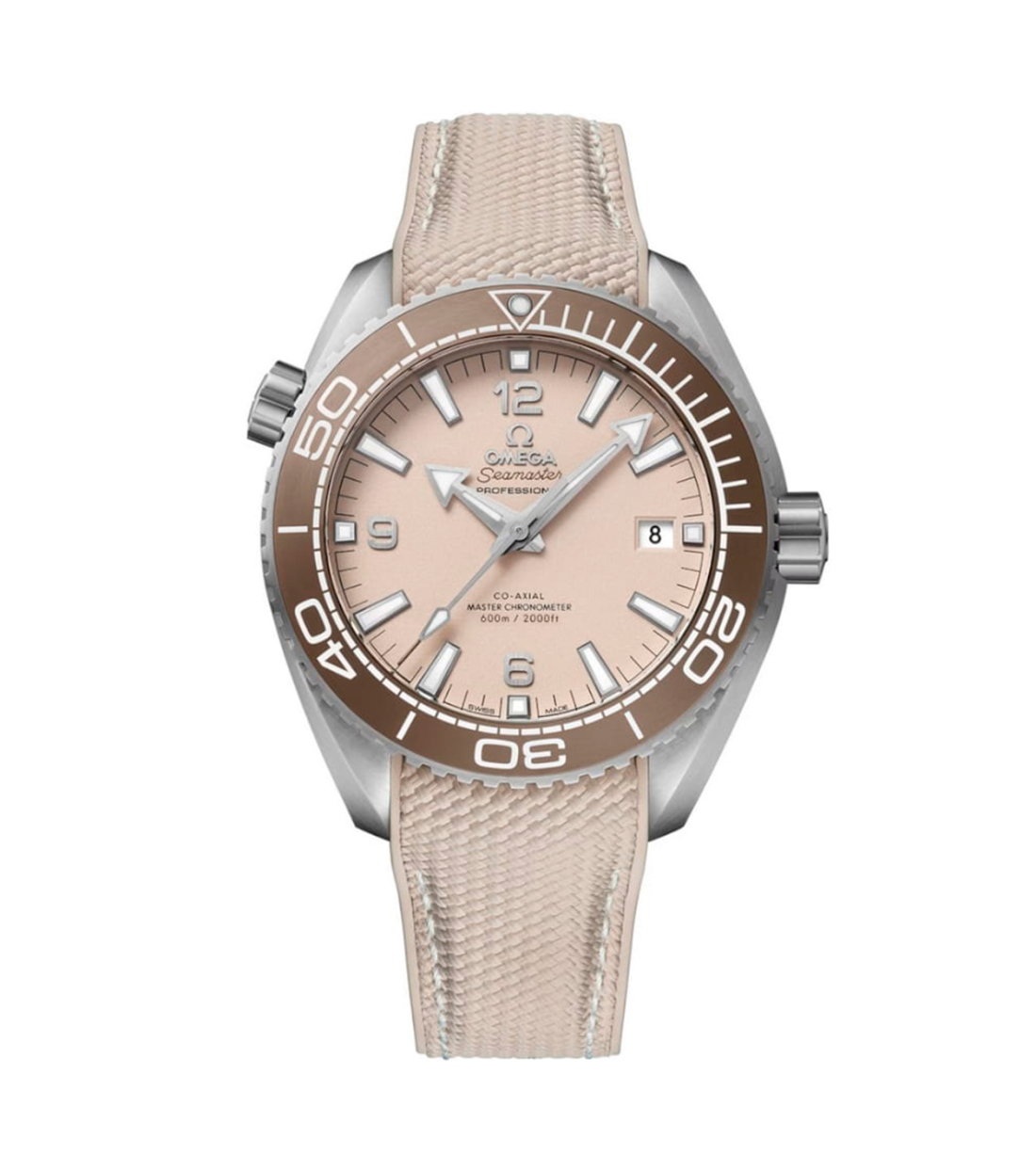 Powered by the Co-Axial Master Chronometer calibre 8900 movement, this Seamaster Planet Ocean is worn on an integrated beige rubber strap with a structured motif and white stitching. The NAIAD LOCK caseback is completed by a metallised seahorse on the sapphire crystal.