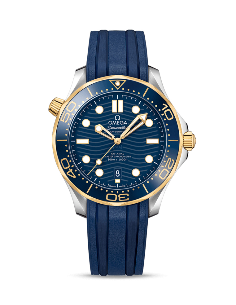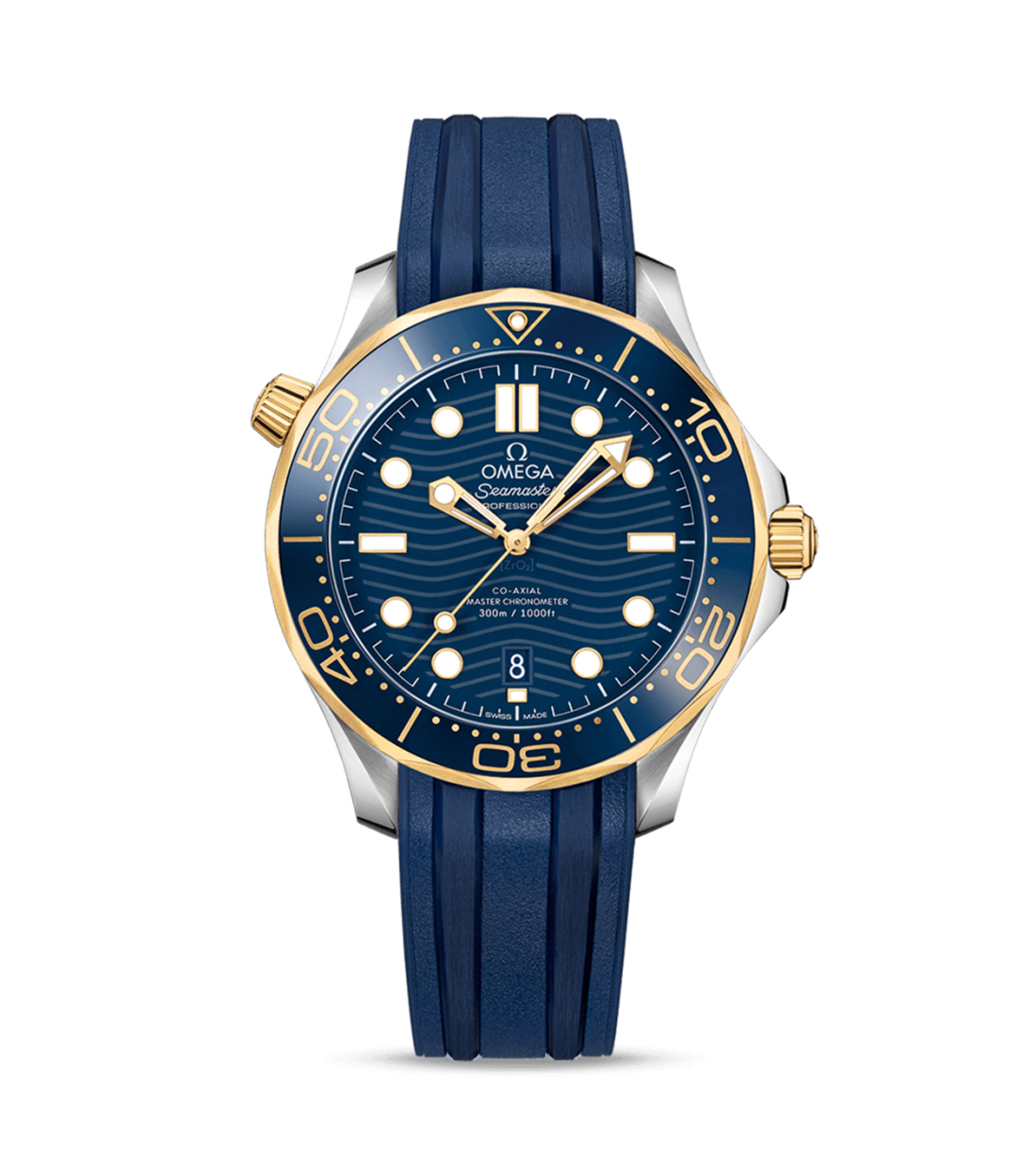 This 42 mm Omga watch, crafted in stainless steel and 18 Ct yellow gold, features a blue ceramic bezel with Ceragold™ immersion scale. The dial is also in polished blue ceramic, with laser-engraved waves and date window at 6 o'clock.