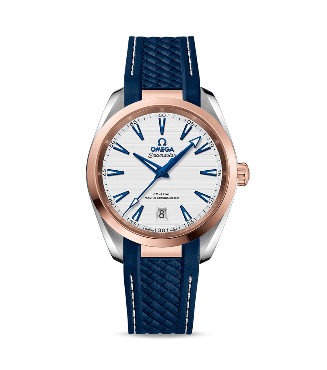 The blue bracelet is made of structured rubber and includes a grey lining and an additional link, in 18 Ct Sedna™ gold, which integrates it with the case. This certified chronometer is powered by the OMEGA Master Chronometer calibre 8800 and bears the industry's highest level of certification from the Swiss Federal Institute of Metrology (METAS).