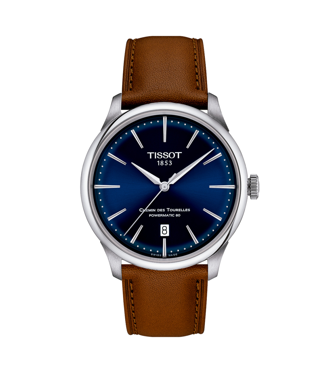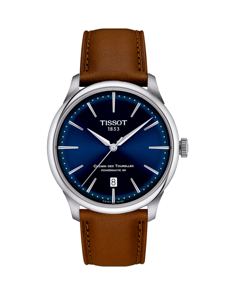 Close your eyes and think of a purely Swiss watch and you will see the Chemin des Tourelles. Named after the street that leads to Tissot's home in the Swiss mountains, it is the Tissot icon: round, classic, mechanical, timeless. Now updated and refined, this edition has a gently domed sapphire crystal that sits atop a soft sunray dial with simple, elegant baton hour-markers, each faceted to catch the light in a discreet yet sophisticated way. And beneath it is the Nivachron Powermatic 80, a state-of-the-art automatic mechanical movement with an 80-hour power reserve and high antimagnetism. A watch for all times.