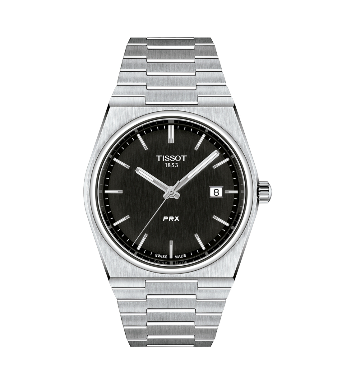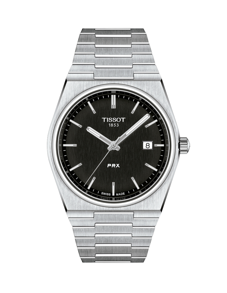 Tissot reissues an iconic design from the late 1970s, with integrated case and bracelet. The Tissot PRX 40 205 case measures 40 mm in diameter and is characterized by its barrel shape. It accommodates a slim, rounded bezel. The Tissot PRX 40 205 Quartz is dressed with a soleil dial in black or blue, along with luminescent indexes and hands, or a silvered and satin-brushed dial that is accompanied by rose gold indexes and hands.