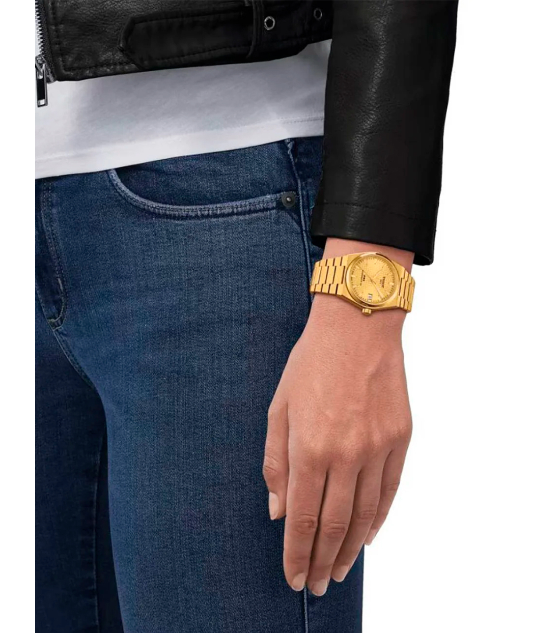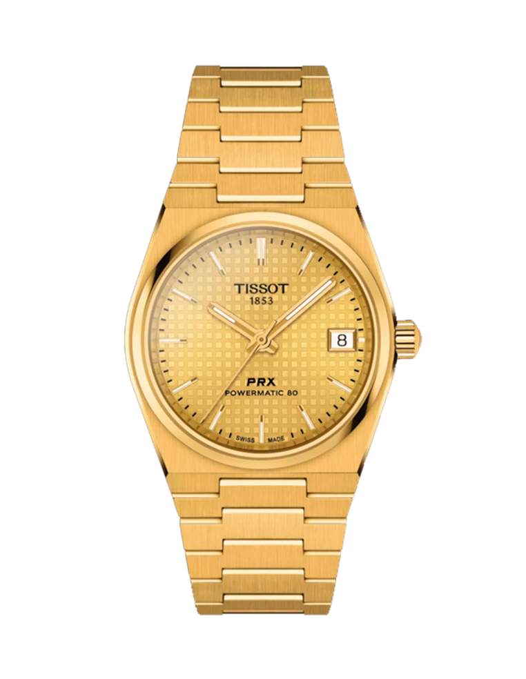 Tissot PRX 35mm Powermatic 80, a harmonious blend of nostalgic glamour and contemporary ingenuity. This 35 mm watch features a high-quality gold-plated PVD case and a striking gold-coloured dial. The bold and decisive gold variant brings an undeniable touch of audacity to this automatic model. The waffle-shaped dial design adds further distinction to this timepiece. With a water resistance of up to 100 metres and a Nivachron™ balance spring, the PRX is an exquisite timepiece for those who appreciate the art of watchmaking. The satin-brushed steel bracelet with triple steel folding clasp guarantees unwavering comfort. Dare to wear the Tissot PRX 35mm Powermatic 80 in gold-PVD.