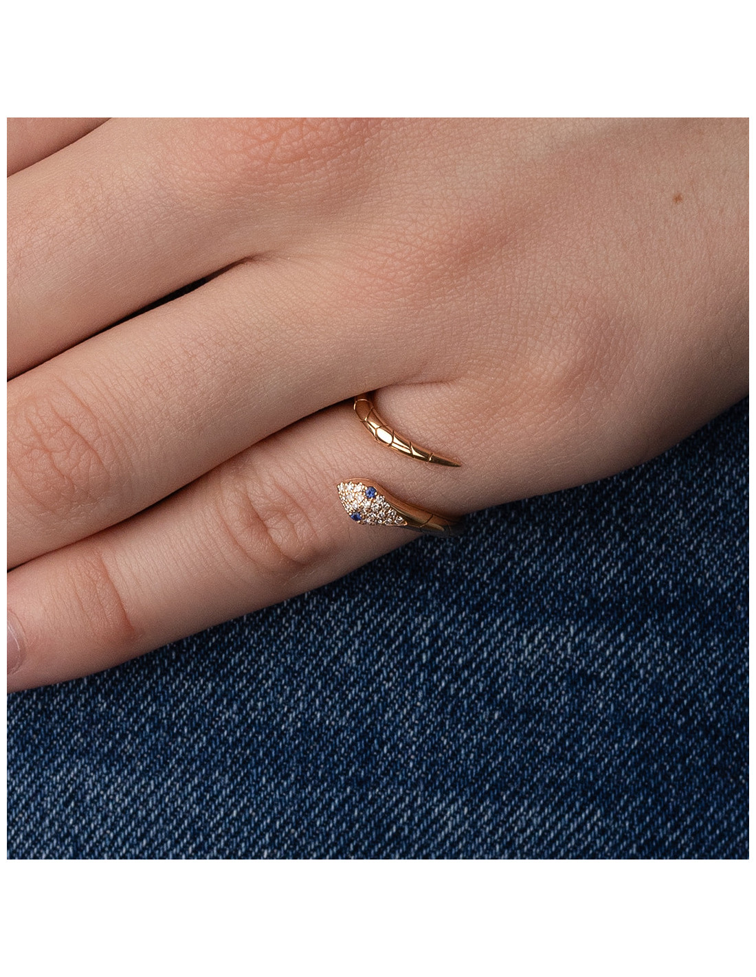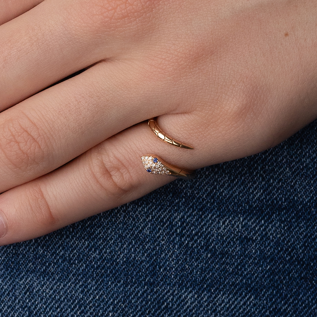 Los pequeños diamantes que engalanan el cuerpo de la serpiente añaden un toque de brillo y luminosidad a la pieza. Su delicado centelleo realza la belleza natural del oro rosa y el zafiro, creando un efecto resplandeciente que te acompañará en cualquier ocasión.
