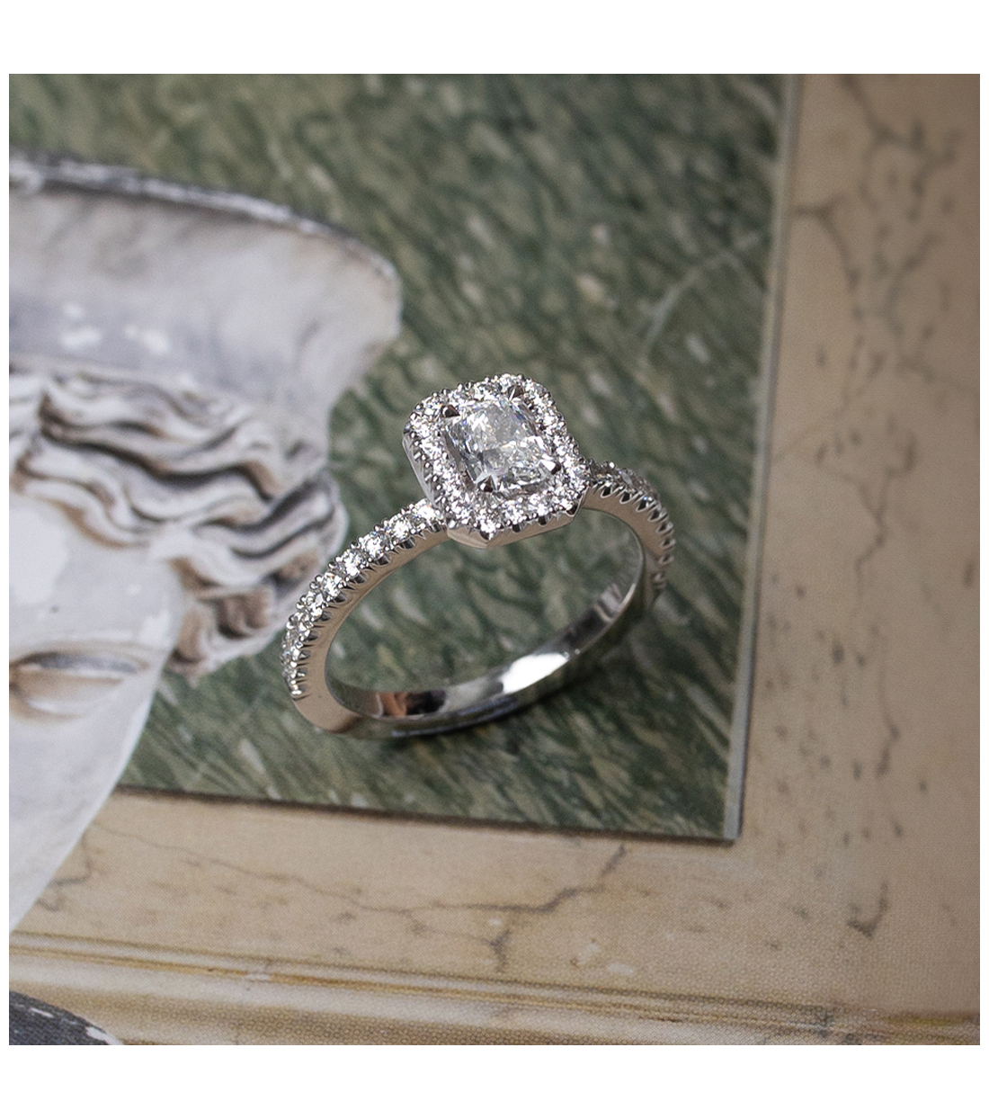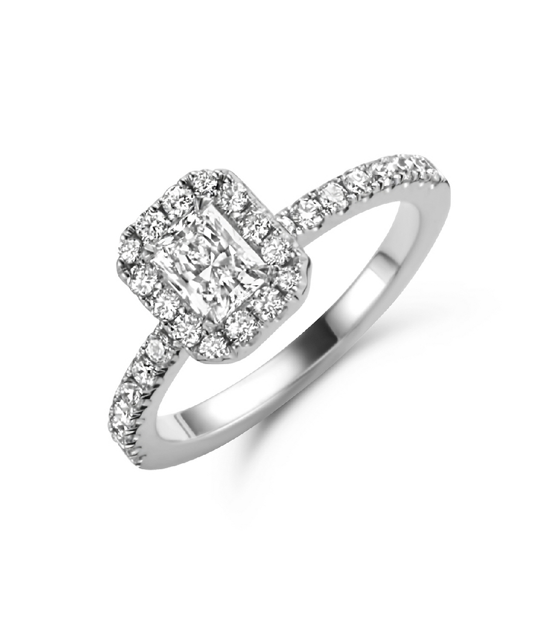 Anillo de compromiso "Alejandra" de oro blanco con diamante central talla princesa y bisel de diamantes talla brillante (0,92 Cts.). Una pieza única para un momento inolvidable.
