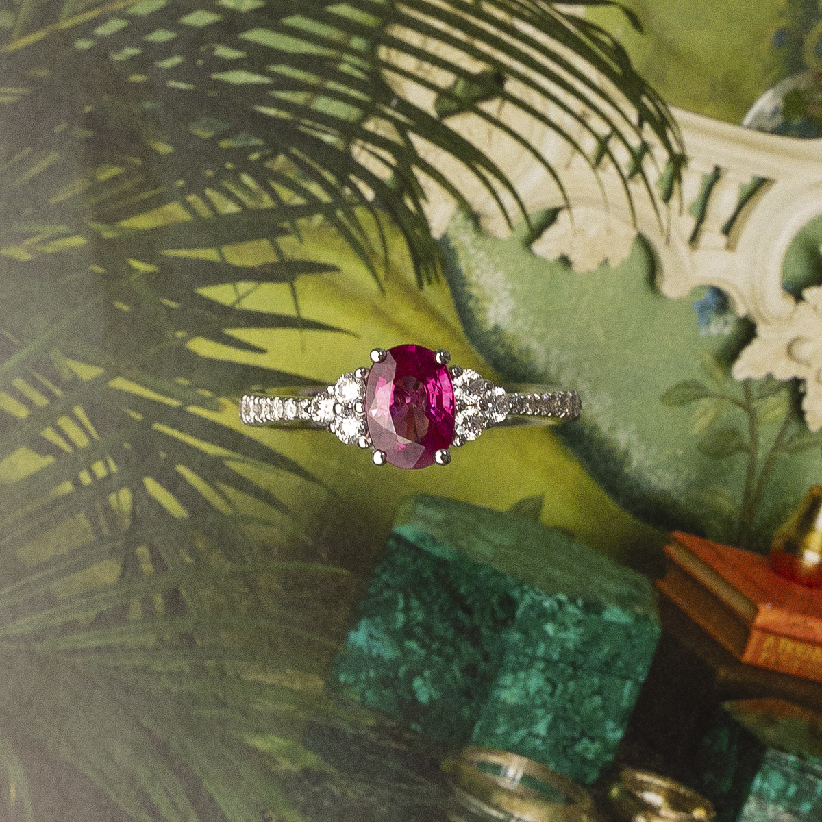 Anillo "Valentina" de oro blanco con diamantes y rubí. Elegancia atemporal para cualquier ocasión.