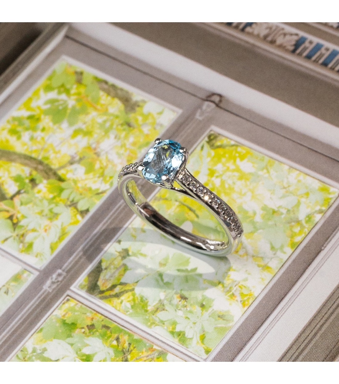 Anillo "Mar" de oro blanco con diamantes talla brillante (0,16 cts) y topacio sky. Un diseño atemporal y elegante para cualquier ocasión.