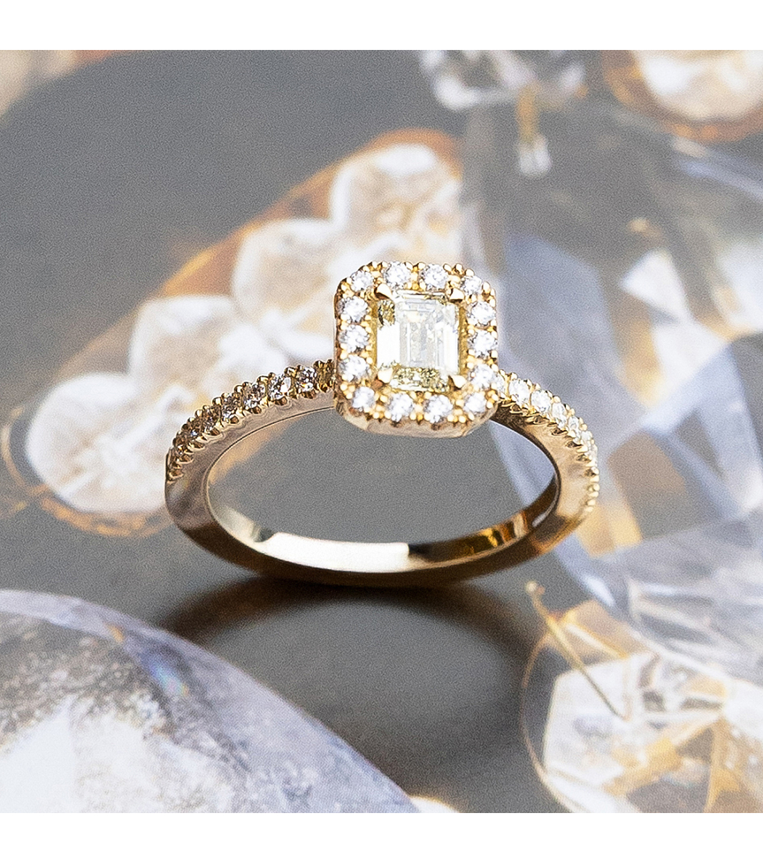 Anillo de compromiso "Genoveva" de oro amarillo con diamante central talla esmeralda y bisel de diamantes talla brillante. Una pieza única para un momento inolvidable.