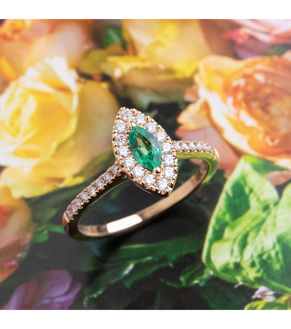 Anillo "Sofia" de oro rosa de 18Kt con esmeralda talla marquesa 0,25Cts. y diamantes talla brillante 0,31Cts. Perfecto para añadir un toque de sofisticación a tu estilo diario.