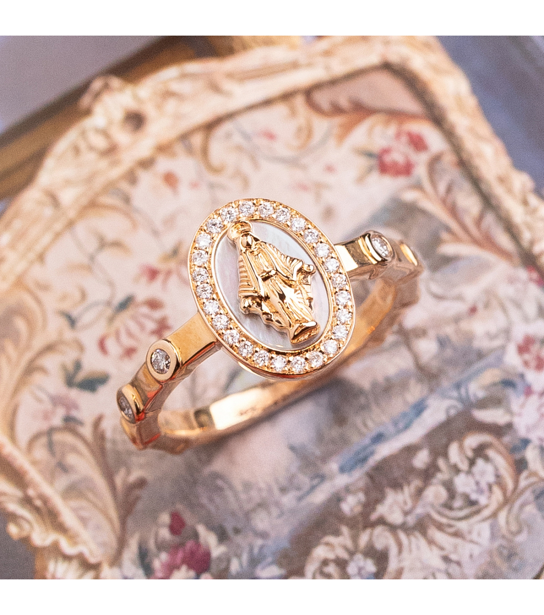 Anillo "Virgen De La Milagrosa" de oro rosa con diamantes talla brillante 0,31Cts. y madre perla 0,46Cts. Un detalle de gran significado espiritual y belleza.