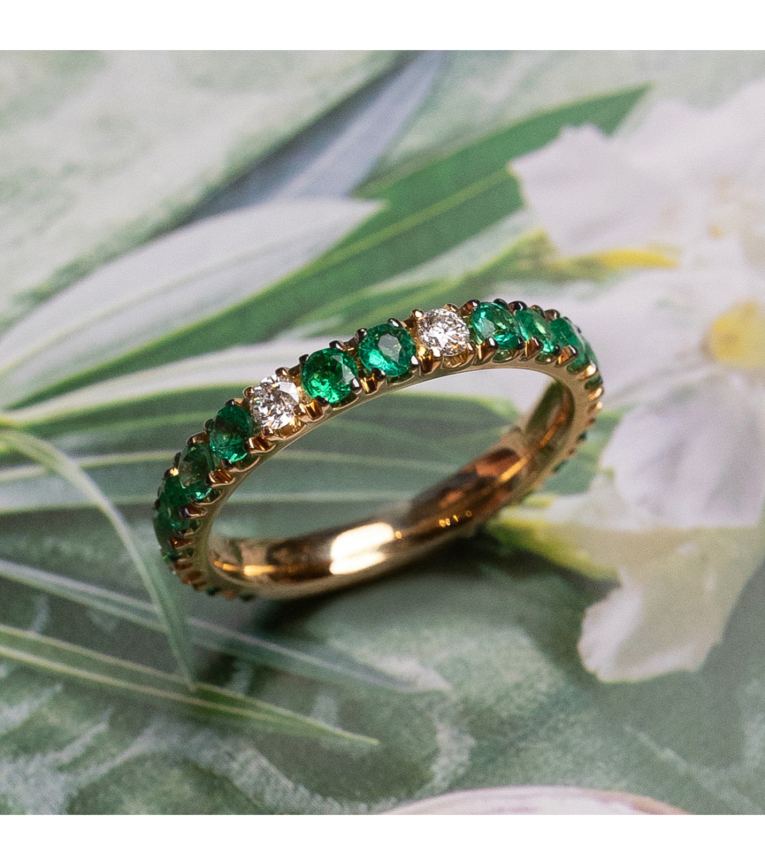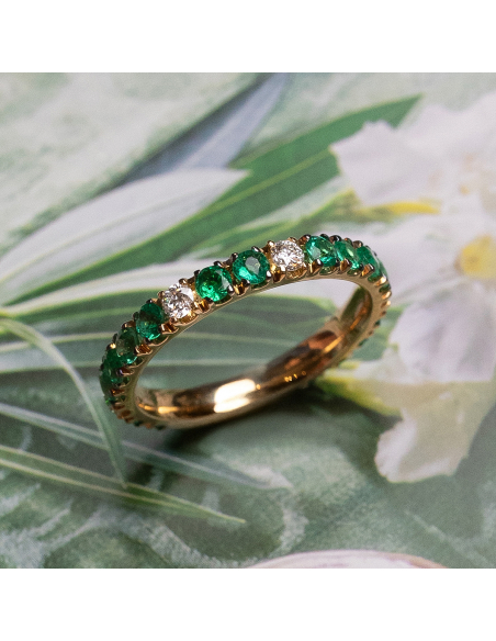 Anillo alianza completa "Ava" de oro amarillo con esmeraldas talla brillante (1,04 Cts.) y diamantes talla brillante (0,25 Cts.). Un diseño sofisticado y versátil, ideal para cualquier ocasión.