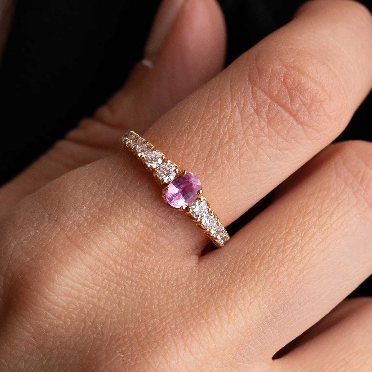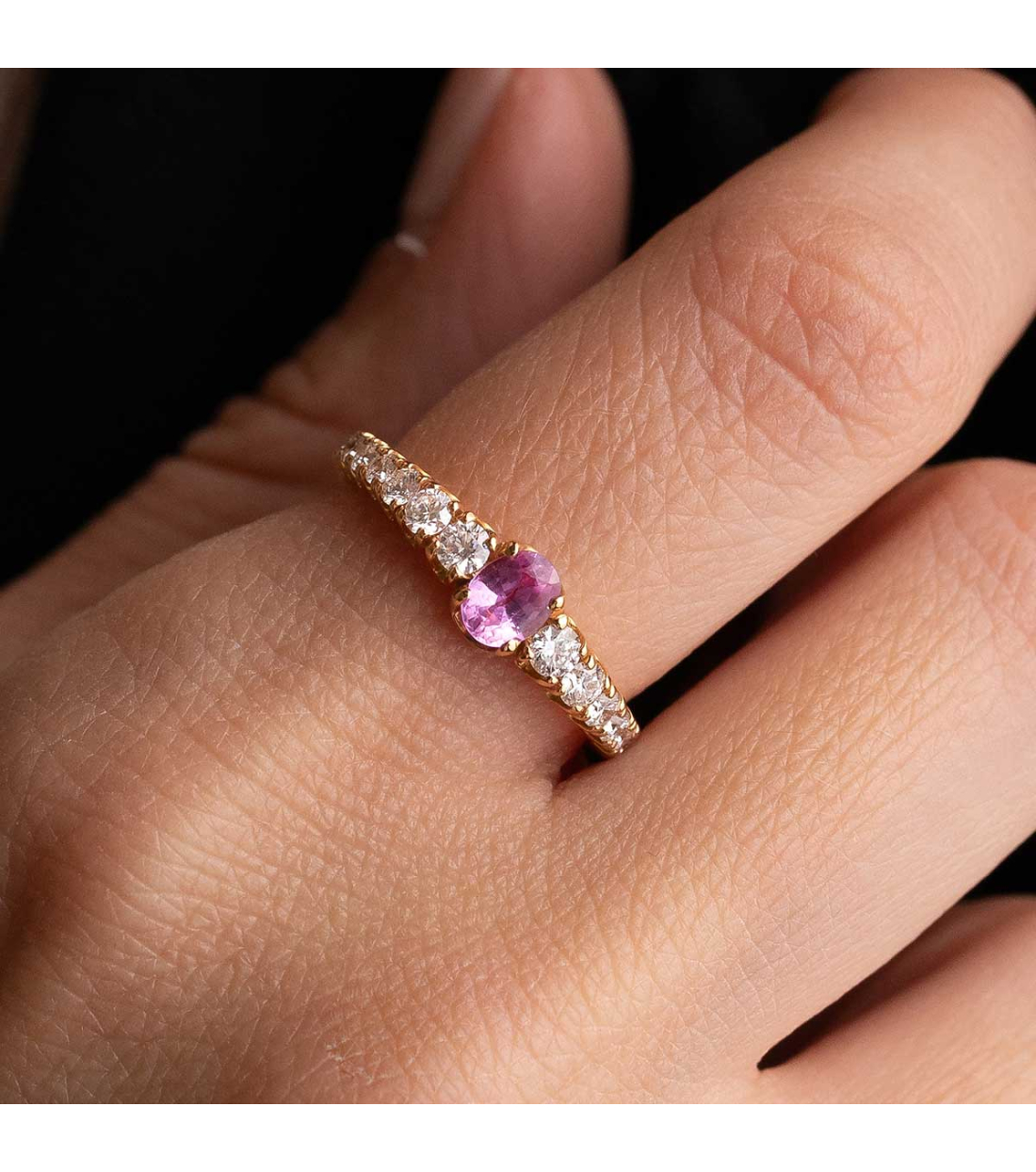 Anillo "Kimiye" de oro rosa de 18Kt con diamantes talla brillante 0,73Cts y zafiro rosa talla oval 0,41Cts. Diseño elegante y moderno ideal para un look diario sofisticado y lleno de luz.
