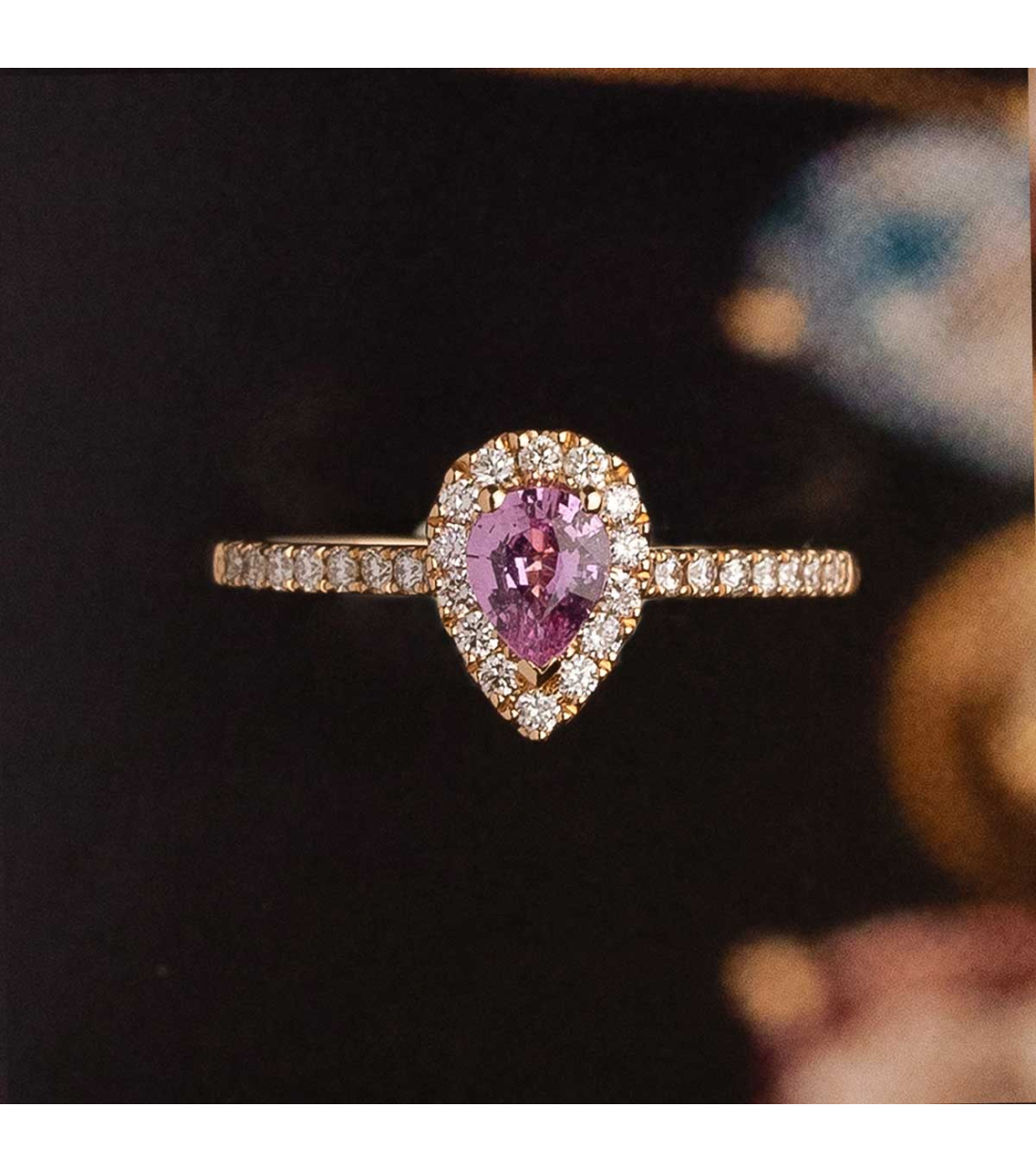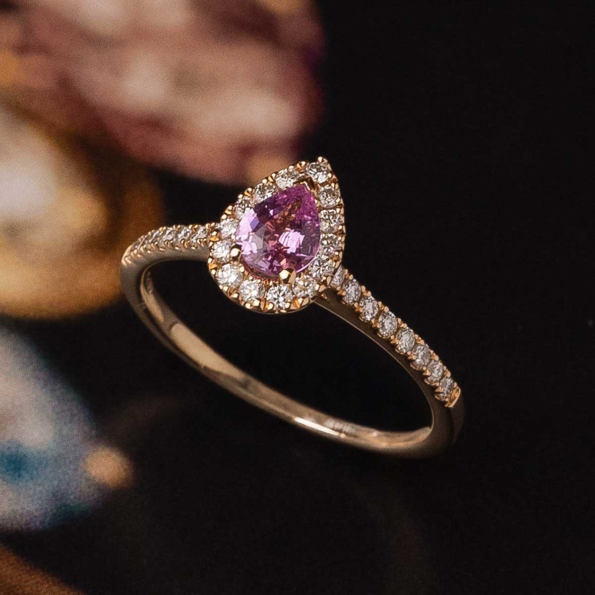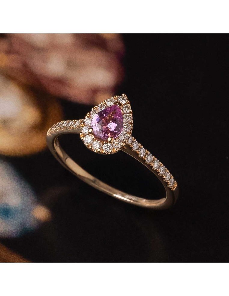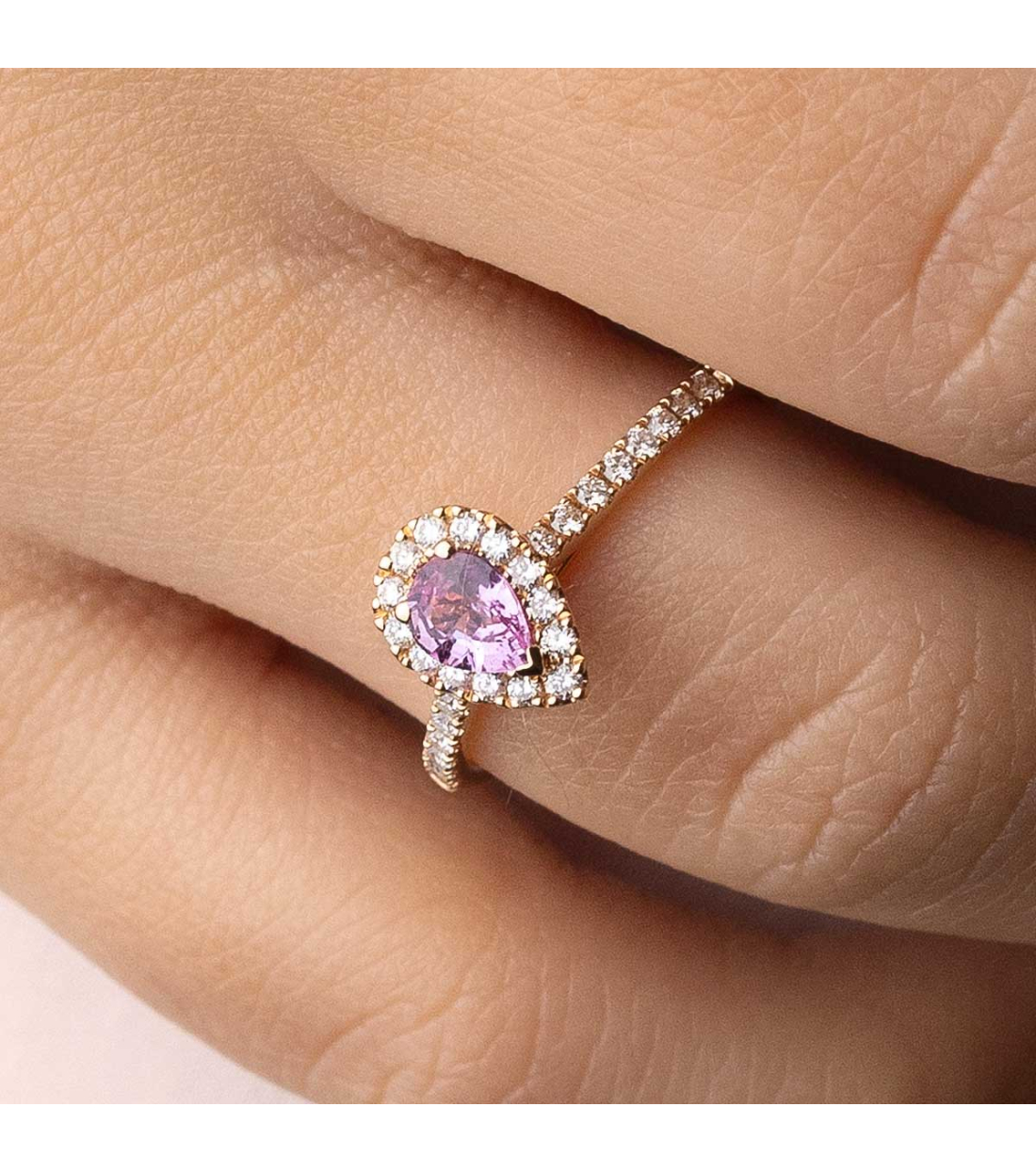 Anillo "Orla" de oro rosa de 1ª Ley de 18Kt. con diamantes talla brillante 0,24 cts. y zafiro rosa talla pera 0,37 cts. Un destello envolvente que ilumina cada movimiento.