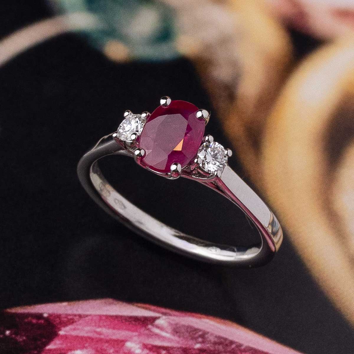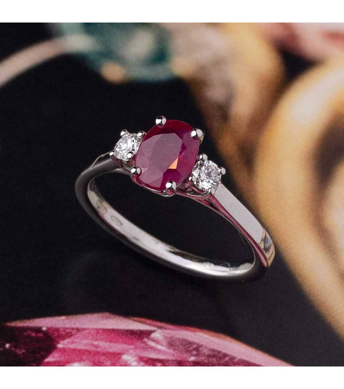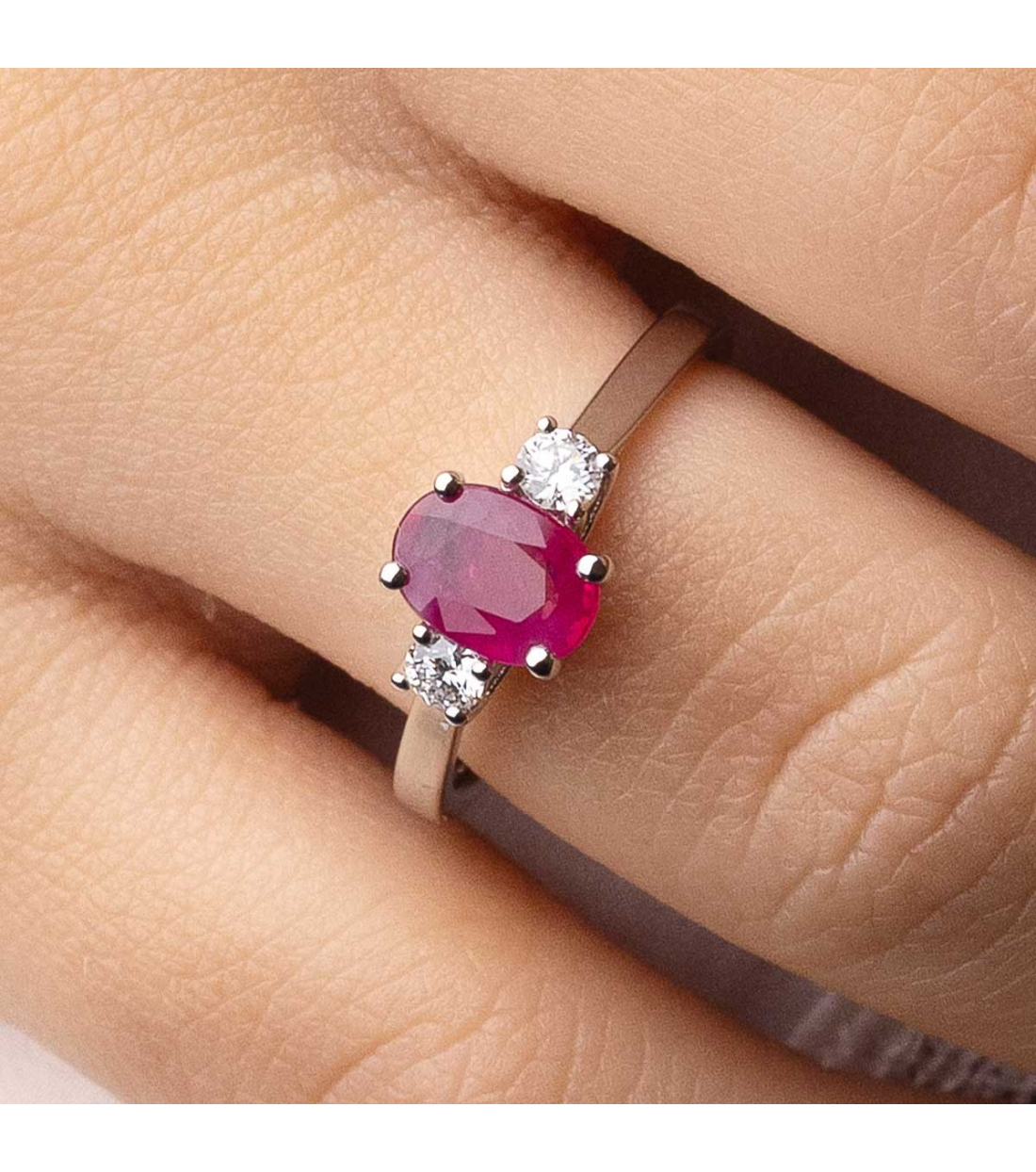 Anillo de trilogy "Isla" de oro blanco de 1ª Ley de 18K con rubí oval y diamantes. Diseño único y elegante, perfecto para un momento inolvidable.