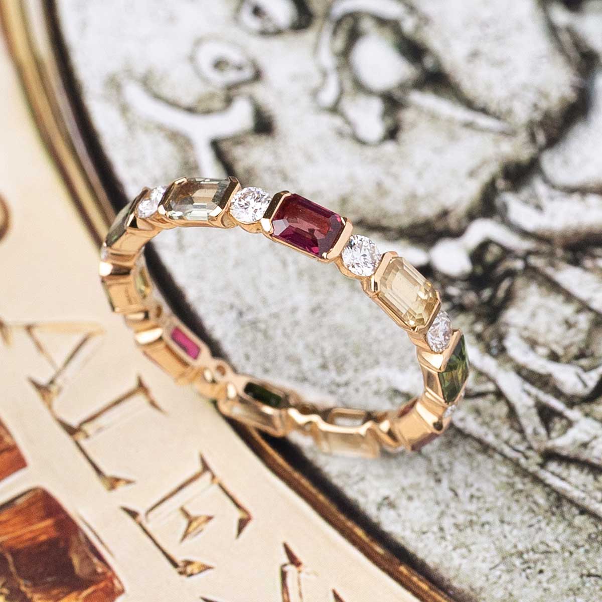 Anillo "Cameron" de oro rosa de 1ª Ley de 18Kt. con diamantes talla brillante 0,56 cts. y zafiros multicolor talla esmeralda 1,86 cts. Una pieza luminosa, cómoda y atemporal que invita a expresarte a través del color.