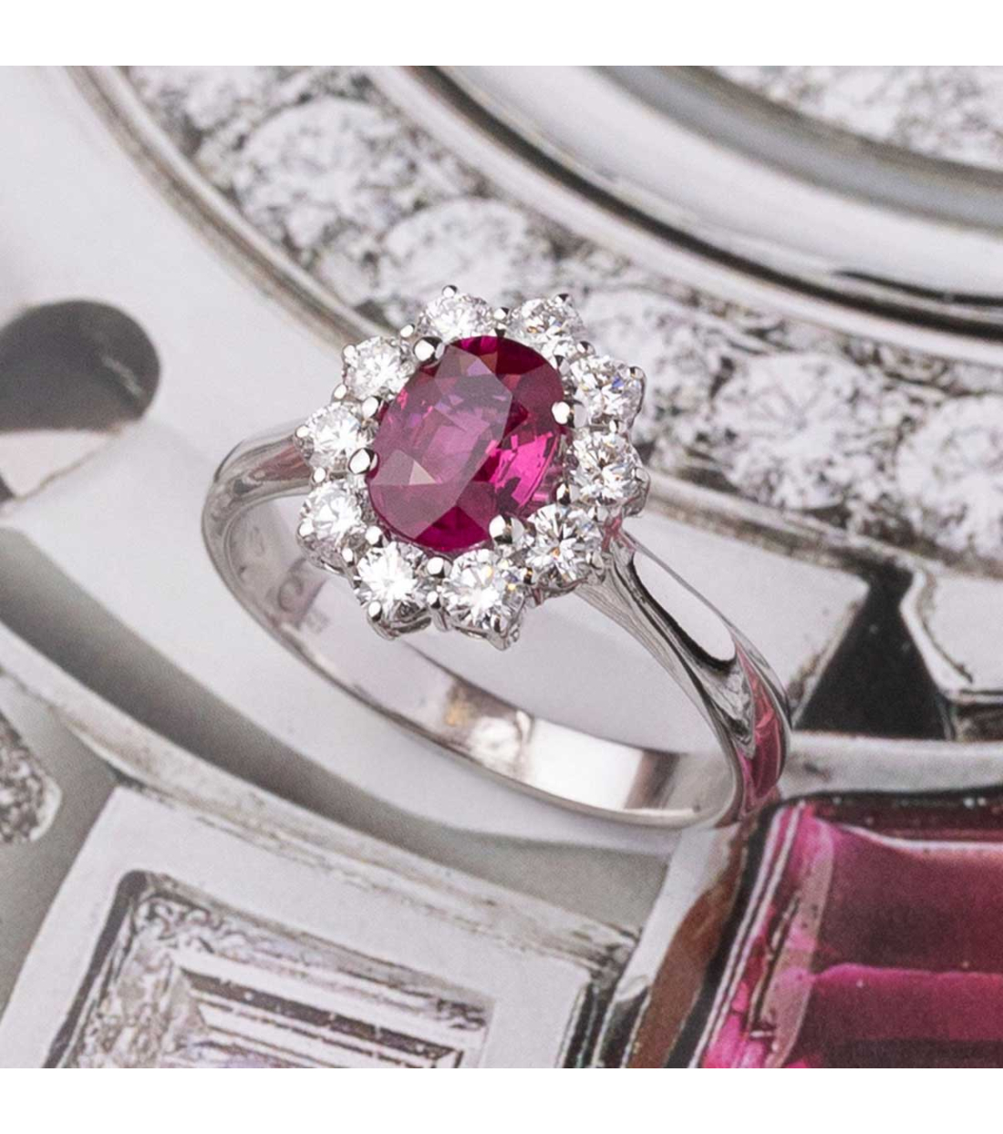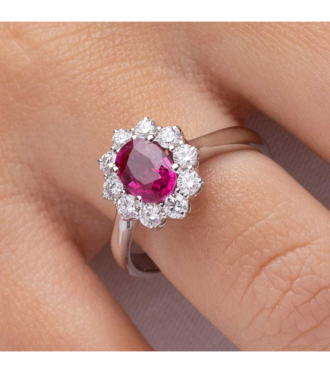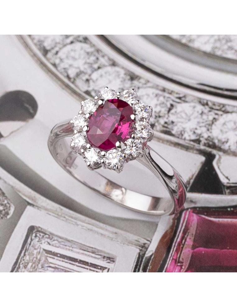 Anillo "Medeleine" de oro blanco de 1ª Ley de 18Kt con diamantes talla brillante 0,50 Cts. y rubí talla oval 1,13 Cts. Belleza clásica reinterpretada.