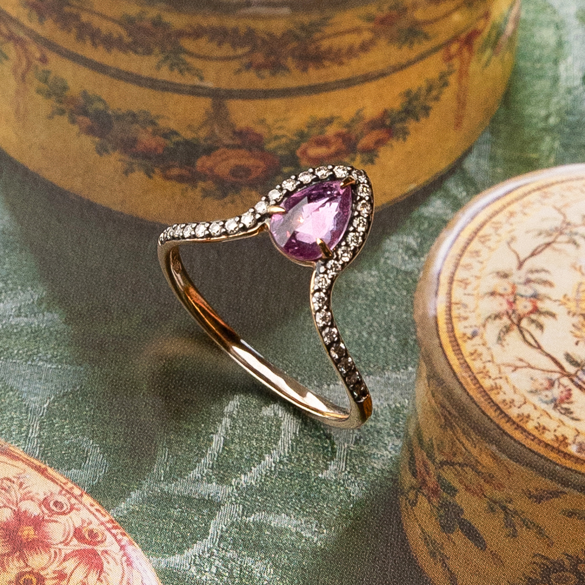 Anillo "Seila" de oro rosa con zafiro rosa talla pera con diamantes talla brillante. Ideal para regalos y ocasiones especiales.