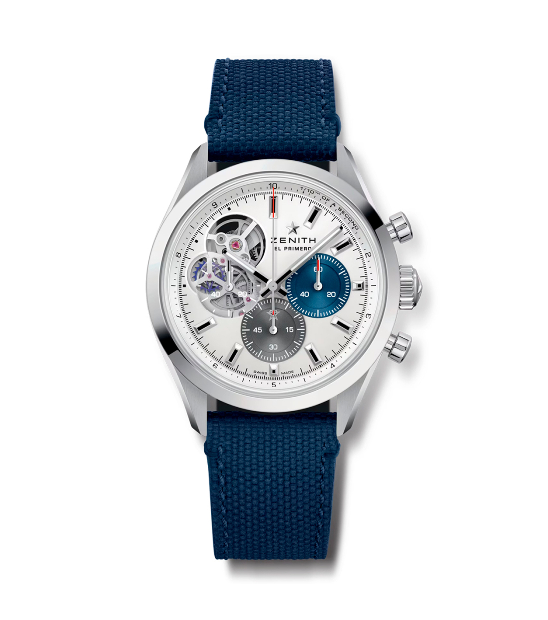 El CHRONOMASTER Open permite observar el corazón palpitante del movimiento El Primero desde la esfera. Esta versión, fabricada en una elegante caja de acero de 39,5mm, presenta una esfera plateada mate, contadores tricolores y un contador transparente para el segundero, así como una correa de caucho azul con efecto 'cordura'. Está equipado con el movimiento de cronógrafo automático El Primero 3604 con indicación de las décimas de segundo.