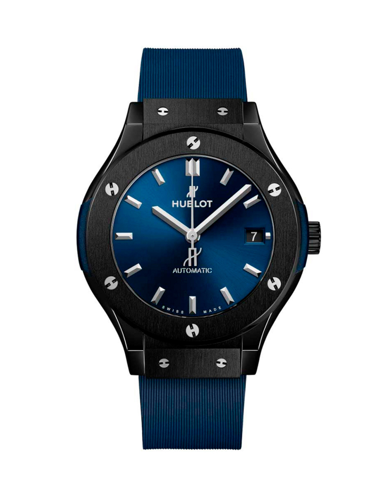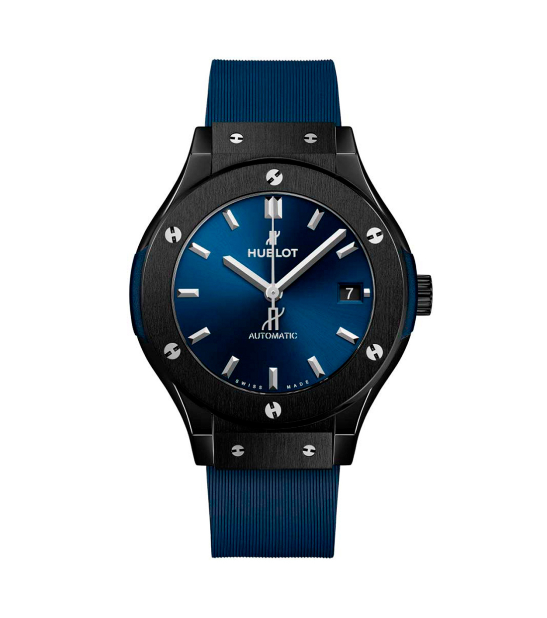 Reloj Hublot con caja de cerámica negra pulida y satinada. Diámetro 38 mm. Luneta de cerámica negra satinada y pulida con 6 tornillos de titanio en forma de H. Hermeticidad 50 m o 5 ATM. Cristal zafiro con tratamiento antirreflejos. Esfera satinada rayos de sol azul. HUB1110 Movimiento automático. Reserva de marcha 42 horas. Correa azul caucho estructurado a rayas. Cierre de hebilla desplegable de acero inoxidable con plaqué negro.