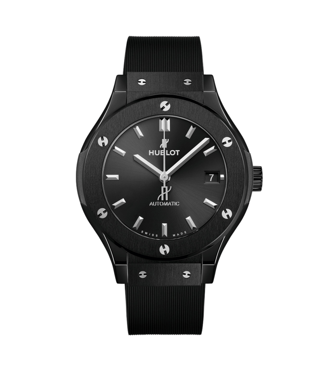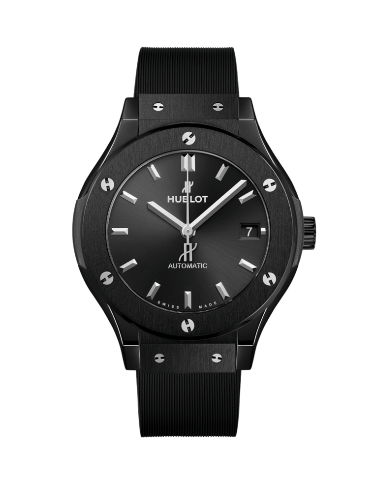 Reloj con caja de cerámica pulida con acabado satinado. Diámetro 38 mm. Luneta de cerámica negra pulida con 6 tornillos de titanio en forma de H. Hermeticidad 50 m o 5 ATM. Cristal zafiro con tratamiento antirreflejos. Esfera negra mate. Movimiento HUB1110 Movimiento automático. Reserva de marcha 42 horas. Correa de caucho negro rayas. Cierre de hebilla desplegable de acero inoxidable con plaqué negro.