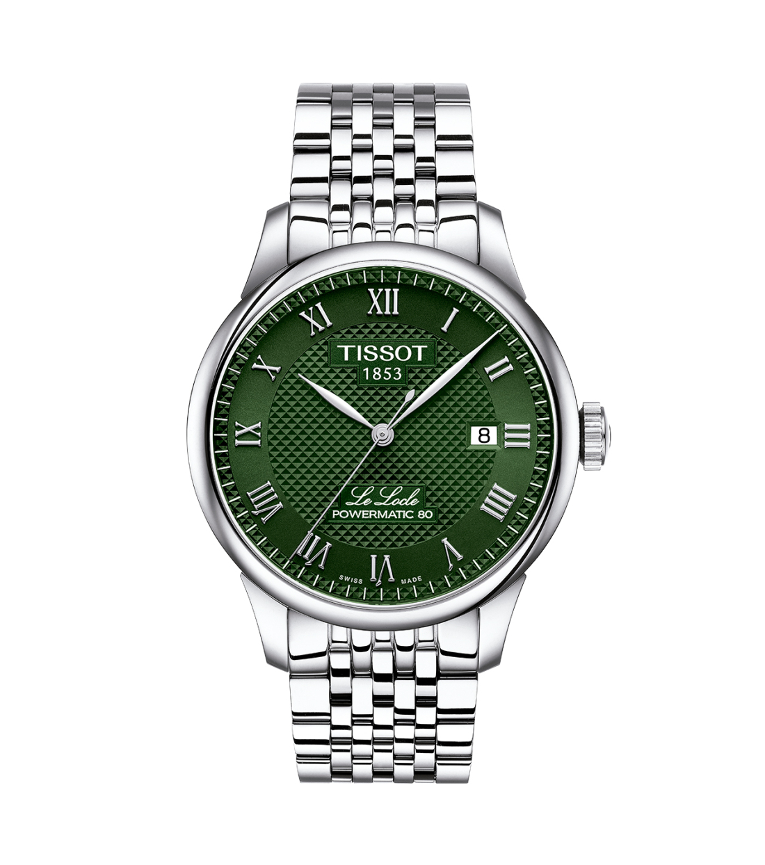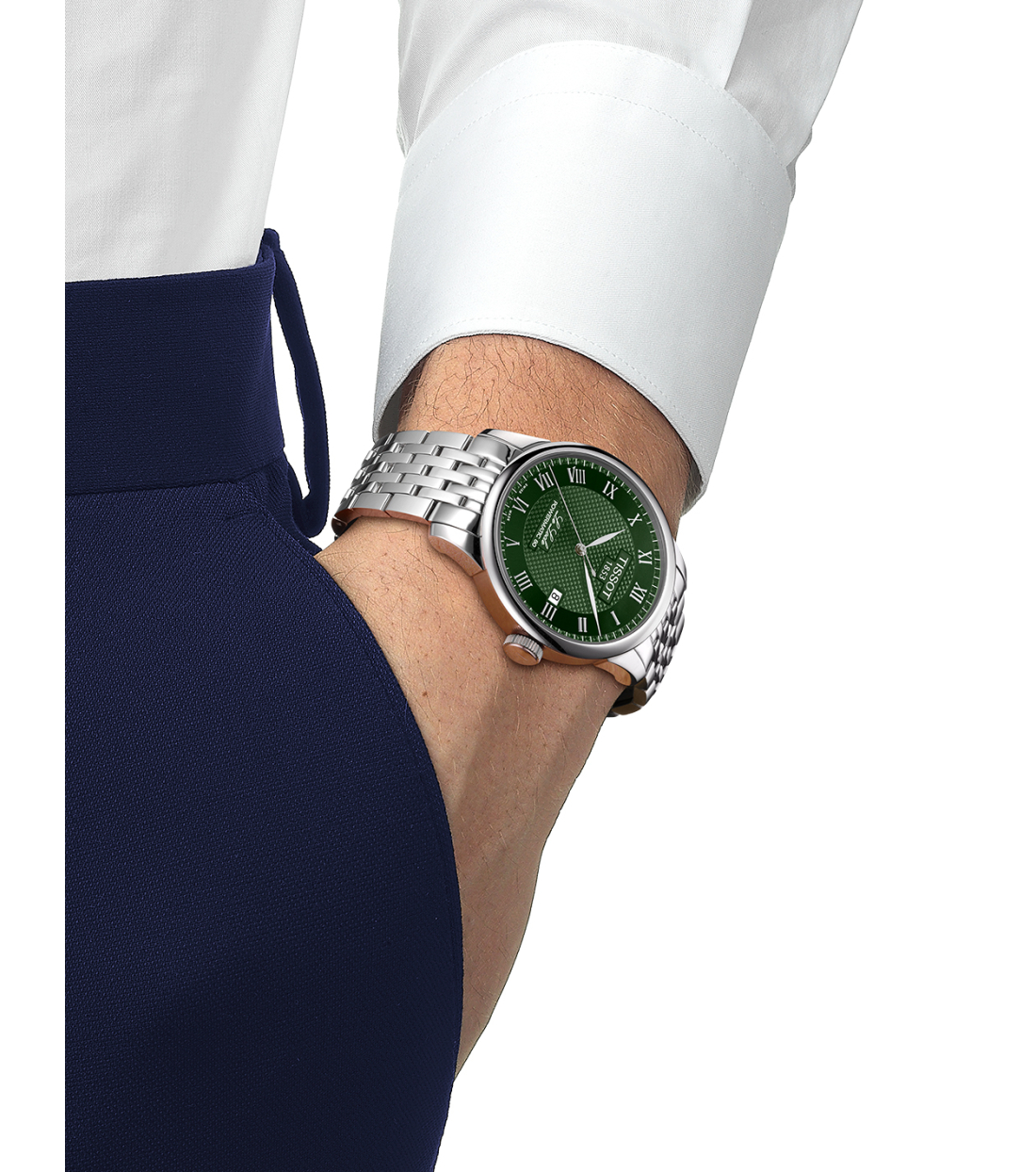 La colección Le Locle apareció por primera vez en 2003 para conmemorar los 150 años de la marca. Este reloj es un pedazo de historia, que encarna el espíritu de innovación que ha definido a Tissot durante más de un siglo. Este modelo presenta una esfera verde y está equipado con brazaletes intercambiables de cierre rápido. Todos los relojes cuentan con la hermosa esfera "guilloché" clous de Paris en forma de pequeñas pirámides, un detalle que realmente marca la diferencia. El juego de acabados pulidos y cepillados de los eslabones crea un ritmo visual cautivador, captando la luz con cada movimiento. Este reloj encarna el encanto de la herencia suiza, y el nombre "Le Locle", inscrito en cursiva en la esfera, añade un toque sofisticado, invitándole a celebrar sus raíces. El último modelo incorpora la vanguardista tecnología Nivachron Spring Balance, que mitiga significativamente los efectos de los campos magnéticos, al tiempo que es resistente a los golpes, el envejecimiento y las variaciones de temperatura. Este modelo incluye una función de fecha y un fondo transparente que revela la fascinante mecánica en funcionamiento.