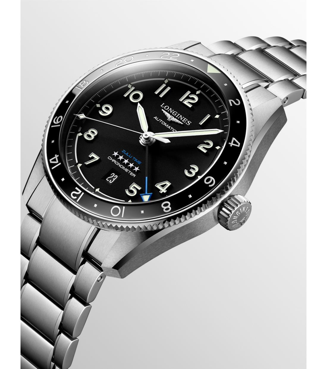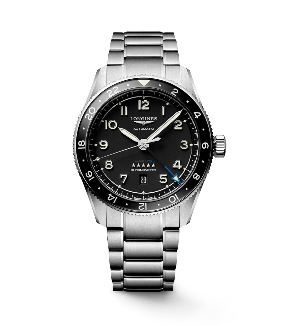 El LONGINES Spirit Zulu time encarna la experiencia centenaria de la marca en relojes con múltiples husos horarios. Sus orígenes y su nombre provienen del primer reloj de pulsera LONGINES de doble huso horario fabricado en 1925, que presentaba la bandera zulú en su esfera, en referencia a la letra "Z" que designa la hora universal para los aviadores. Estéticamente, el LONGINES Spirit Zulu Time destaca por su meticulosa ejecución y por el especial cuidado de los distintos detalles. Presenta un bisel giratorio bidireccional con incrustación de cerámica. Cada modelo está equipado con un exclusivo calibre LONGINES, con espiral de silicio, resistente a los campos magnéticos y con el certificado de cronómetro del COSC.